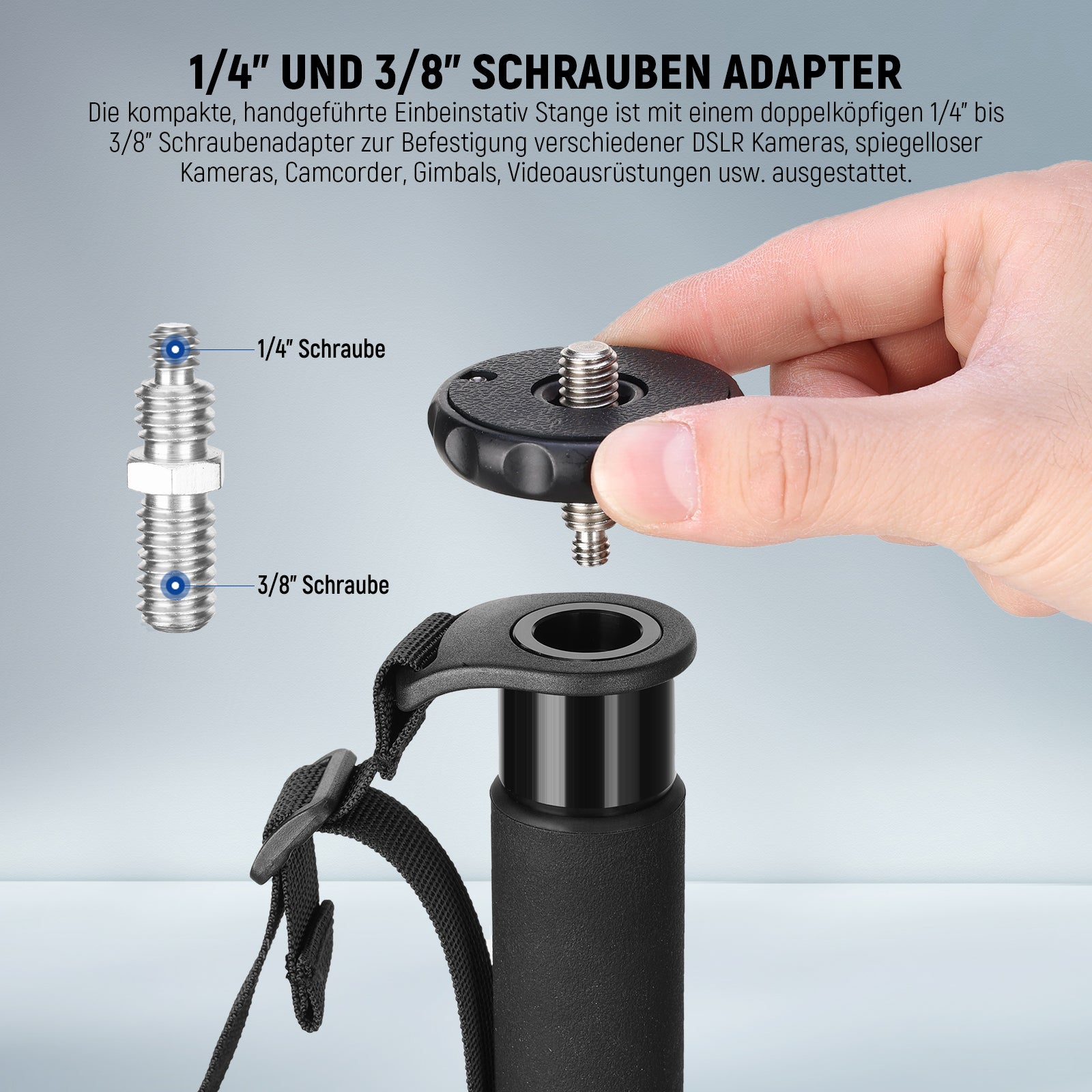 - 1/4" und 3/8" Schraubadapter- Das kompakte handgehaltene Einbeinstativ ist mit einem doppelköpfigen 1/4" bis 3/8" Schraubadapter zur Befestigung verschiedener DSLR Kameras, spiegelloser Kameras, Camcorder, Gimbals, Video Rigs usw. ausgestattet, kompatibel mit Sony Canon Nikon, kompatibel mit Insta360, kompatibel mit DJI action cams, für Montageadapter, kompatibel mit GoPro, für Telefonhalterungen kompatibel mit iPhone und Android Handys, anderen Foto und Videoausrüstungen, Geräte oder Zubehör