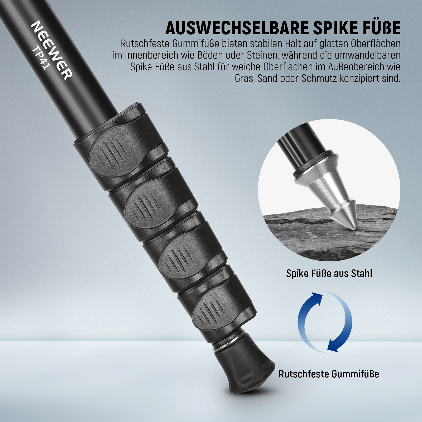 - Austauschbare Spike Füße- Rutschfeste Gummifüße bieten stabilen Halt auf glatten Oberflächen in Innenräumen wie Böden oder Steinen, während die umsetzbaren Spike Füße für weiche Oberflächen im Außenbereich wie Gras, Sand oder Schmutz geeignet sind. Das austauschbare Design dieses Kamerastativs ist flexibel und vielseitig für verschiedene Aufnahmesituationen