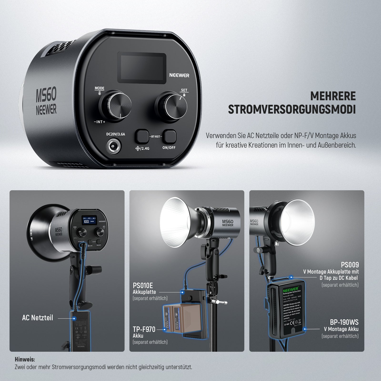 - Mehrere Stromversorgungsoptionen- Schließen Sie die Leuchte für den Innenbereich an eine Steckdose an. Für Stromversorgungslösungen im Freien erwerben Sie bitte separat NP-F Akkus, V Montage Akkus und die entsprechenden Akkuplatten