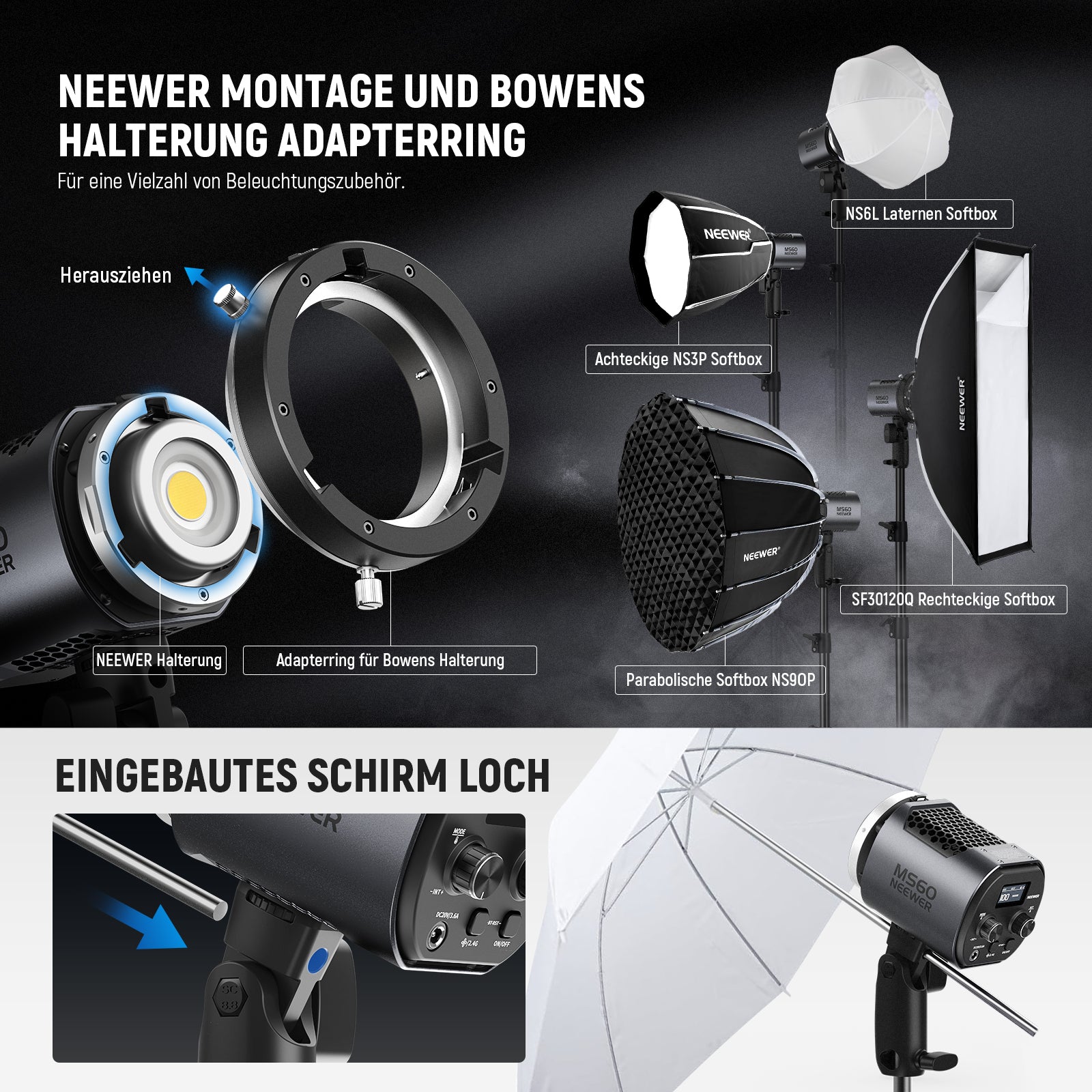 - Bowens Montageadapter im Lieferumfang enthalten- Mit der NEEWER Halterung, dem Bowens Montageadapter und der Schirmfassung können Softboxen, Fotoschirme, Beauty Dishe und andere Lichtmodifikatoren für Porträtfotografie, Interviews, YouTube/TikTok Videos, Filmen und Live Streaming angeschlossen werden