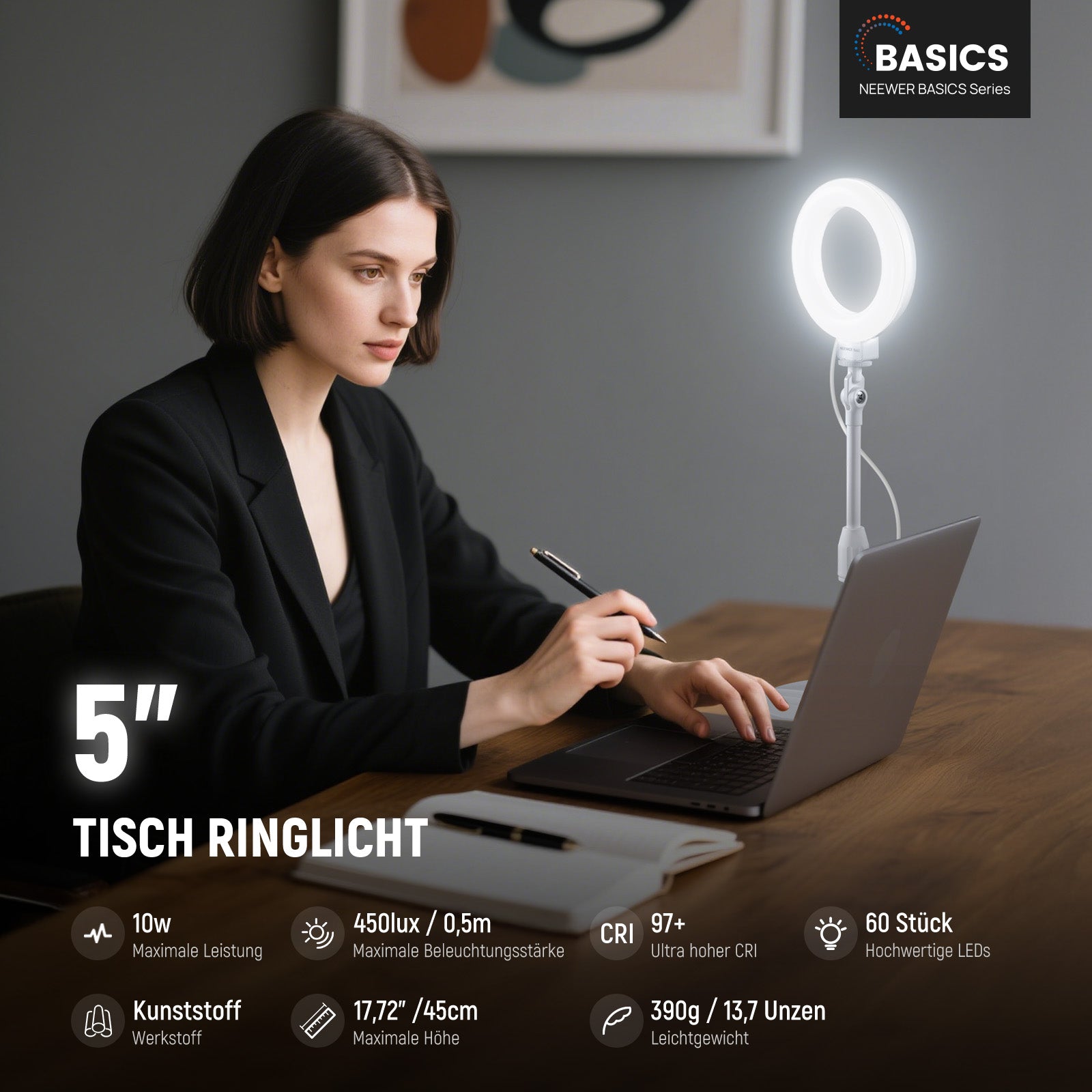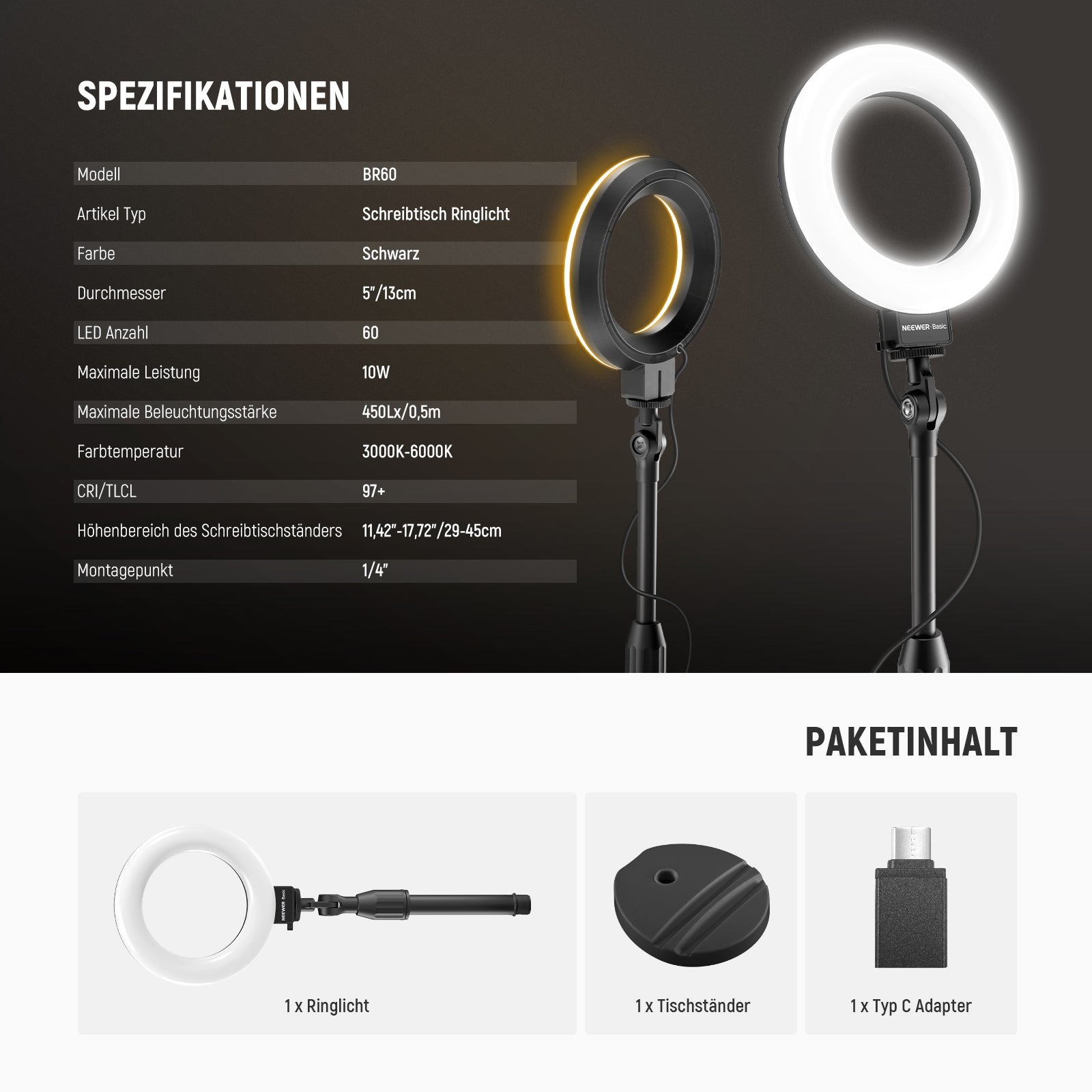 - Einführung in NEEWER BASICS- Einfach und praktisch, NEEWER BASICS Ring Light ist eine preisbewusste Produktlinie, die sich auf wesentliche Funktionen und Designs konzentriert, ohne unnötige Extras und Materialien. Der BR60 ist ein kompaktes, tragbares ringlight mit Tischstativ für Smartphones, das hochwertiges dimmbares lichtring für Smartphones/Laptops/Computer/Monitore beim Gaming, Zoom Anrufen, Home Office Meetings, Videoaufnahmen, Live-Streaming, Selfies und mehr bietet