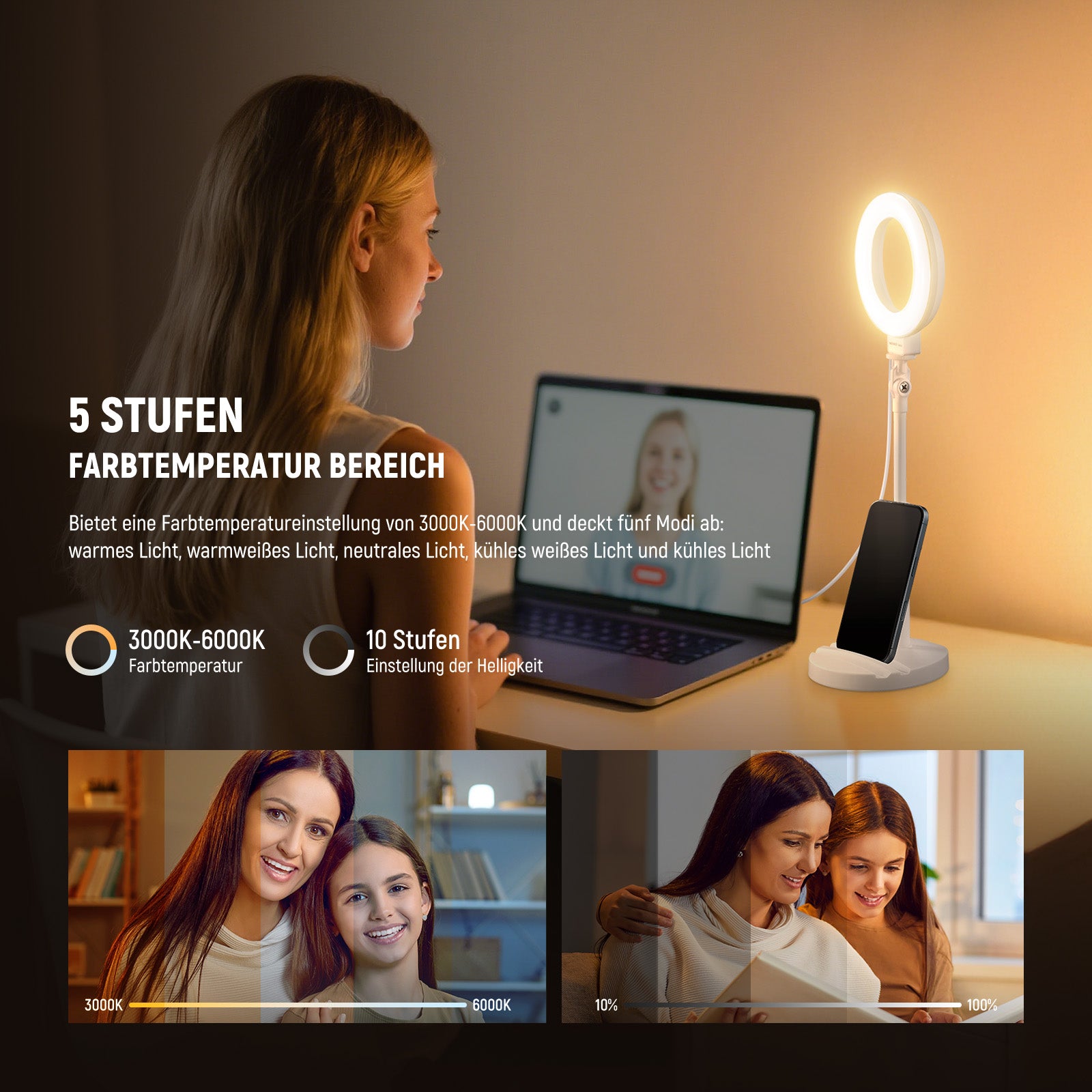 - 5 Lichtmodi & 10%-100% Dimmen- Dieser Tischkreislicht mit 60 LEDs emittiert bis zu 450Lx/0,5m, 3000K-6000K für Warmlicht, gemischtes Warmlicht, gemischtes Licht, gemischtes Kalt und Kaltweißlicht-Modi. Der Dimmbereich von 10%-100% ermöglicht flexible Lichtanpassungen für verschiedene Anforderungen. Mit weichem Licht und CRI97+ ist es perfekt für Visagisten, Selfies, TikTok/YouTube Videoaufnahmen, FaceTime, Podcasts, Laptop Videokonferenzen, Live Streaming, Vlogging usw.