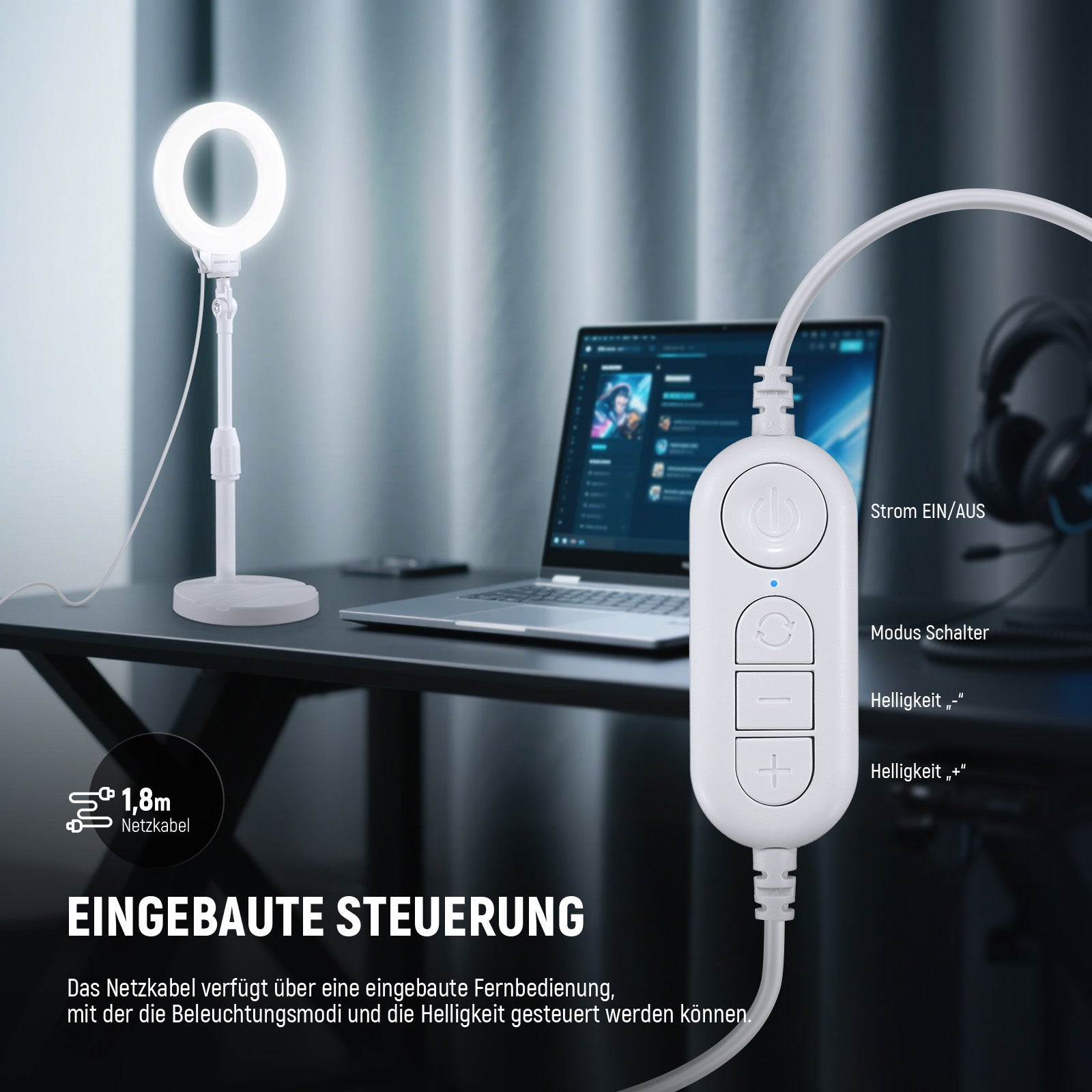 USB betriebene LED Selfie Videolicht- Die kleine, professionelle 10W LED Desktop Ring Fotolicht wird mit 5V/2A betrieben und verfügt über ein integriertes 1,8m langes Ladekabel, das bequem von Bildschirmen, Laptops, tragbaren Ladegeräten oder anderen USB-Stromquellen gespeist werden kann, und bietet flexible Stromversorgungslösungen für bequeme Fotografie, Videografie und tägliche Dauerbeleuchtung