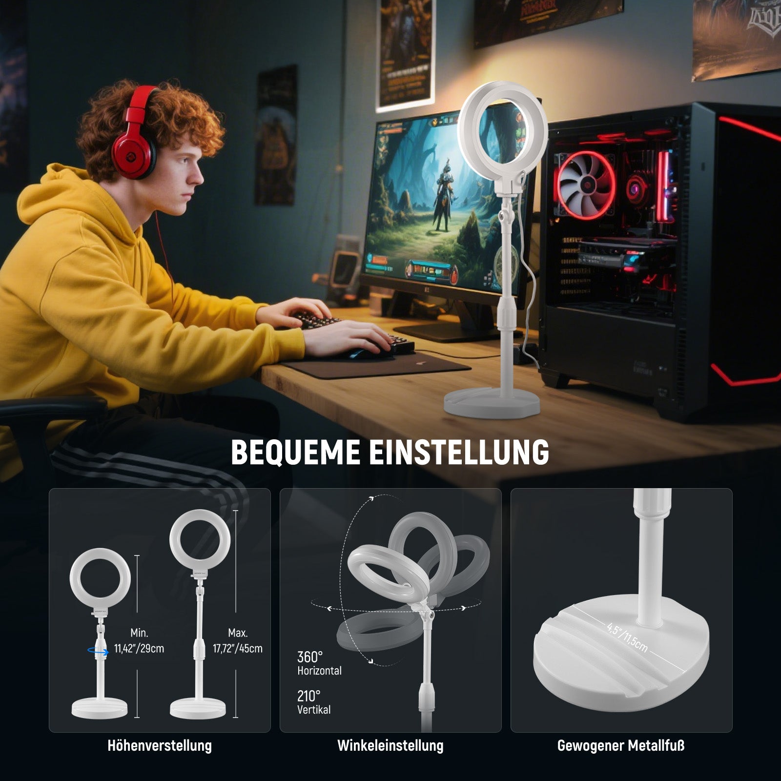 - Einstellbare Höhe & Winkel- Der Tischständer lässt sich stufenlos von 29-45cm (11,42" - 17,72" ) verstellen und mit einem Knopf sicher arretieren, so dass Sie das Ringlicht in der idealen Höhe positionieren können. Er verfügt über einen breiten, dicken und robusten Sockel, der dafür sorgt, dass das gesamte Kit stabil und sicher bleibt. Außerdem lässt sich das Mini LED Halo Ringleuchte für das Handy vor und zurückschwenken und bietet so anpassbare Beleuchtungswinkel für eine Vielzahl von Setups