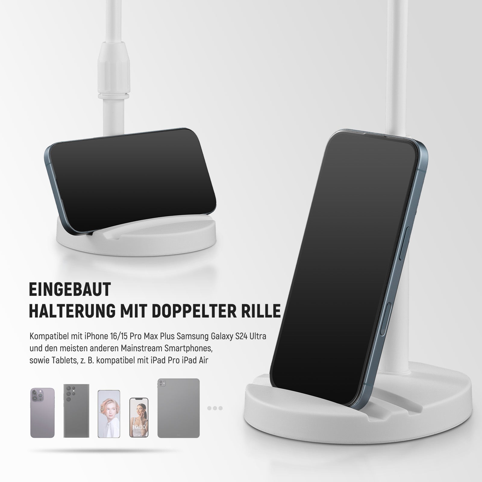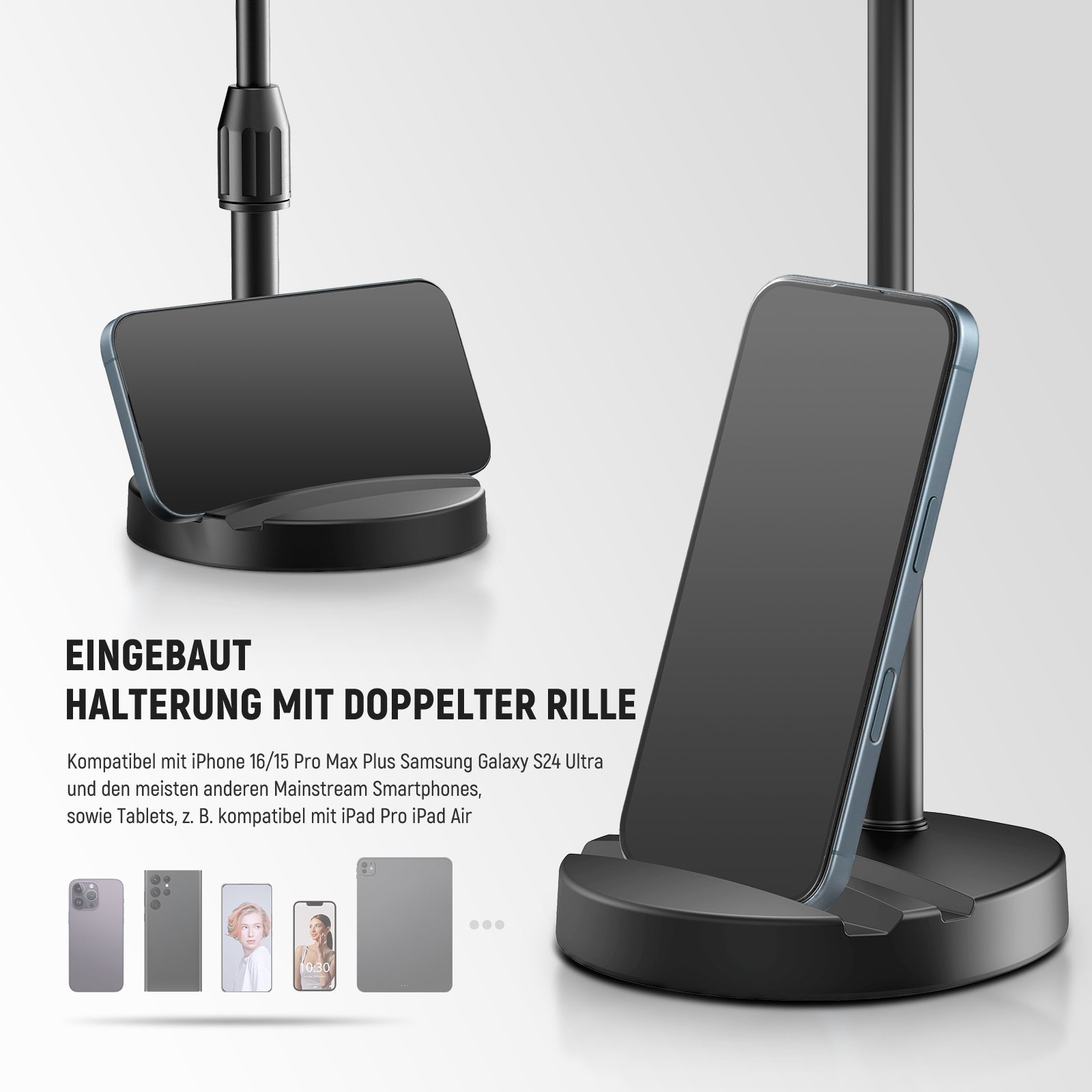 - Für Telefonfotografie- Die Basis des Overhead Ring Licht Ständers verfügt über zwei Rillen, die als Telefonständer für alle Smartphones, kompatibel mit iPhone 16 15 Pro Max Plus Samsung Galaxy S24 Ultra, usw., für die Erstellung von Filmen und Videoaufnahmen funktionieren. Nehmen Sie Fotos und Bilder auf, streamen Sie oder nehmen Sie Videos mit Ihrer Handykamera auf, ohne zusätzliches Handyhalterungszubehör kaufen zu müssen. Geeignet als Content Creator wesentliche Ringlicht