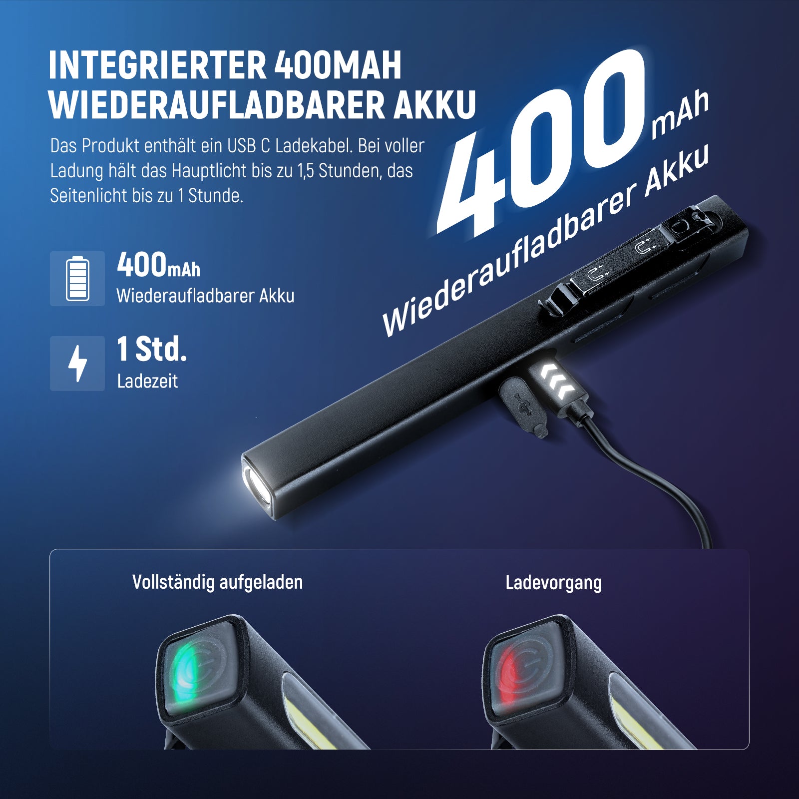 • Akkulaufzeit: 1,5 h (Frontlicht); 1 h (seitliches COB-Licht)