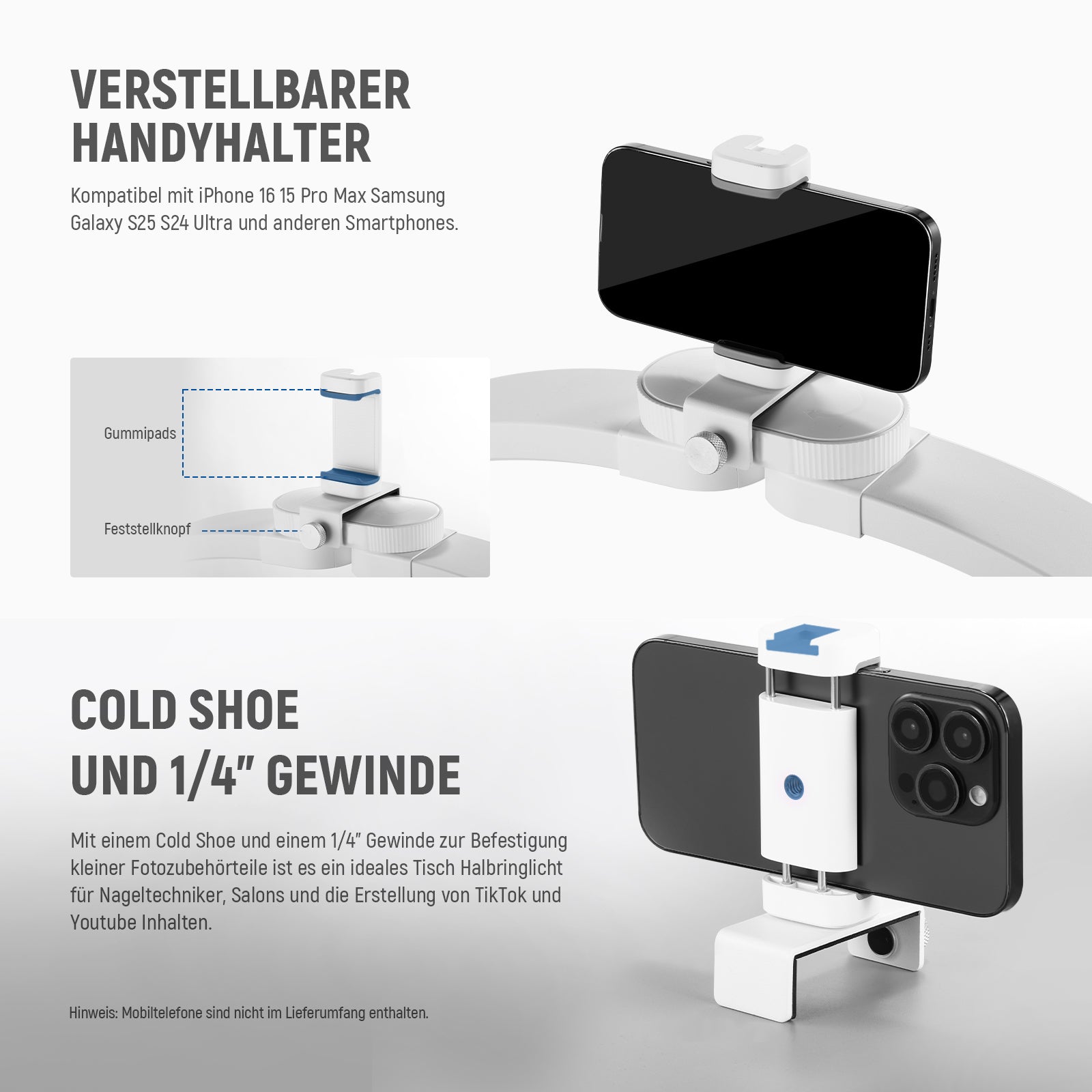 - Verstellbarer Handyhalter- Der Handyhalter des tragbaren LED Halbkreis Tisch Ringlichts ist kompatibel mit iPhone 16 15 Pro Max Samsung Galaxy S25 S24 Ultra usw. Er lässt sich einfach über einen Feststellknopf befestigen, ist drehbar und kann entlang der Lampenkante verstellt werden, um vielseitige Aufnahmewinkel zu ermöglichen. Mit Kaltschuh und 1/4" Gewinde für kleines Foto und Video Zubehör, ideal als Tisch Halbmond Lampe für Nageltechniker Selfies Fotos Video Film für YouTube, TikTok usw.