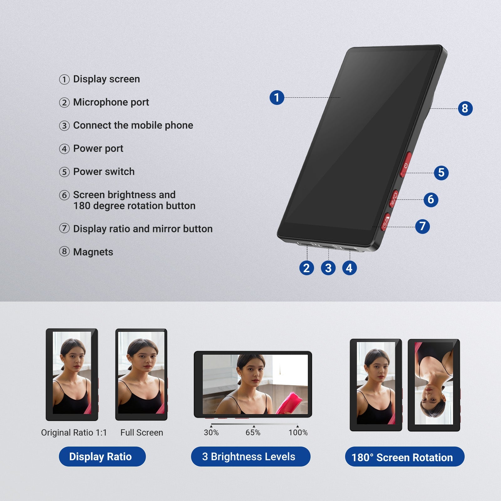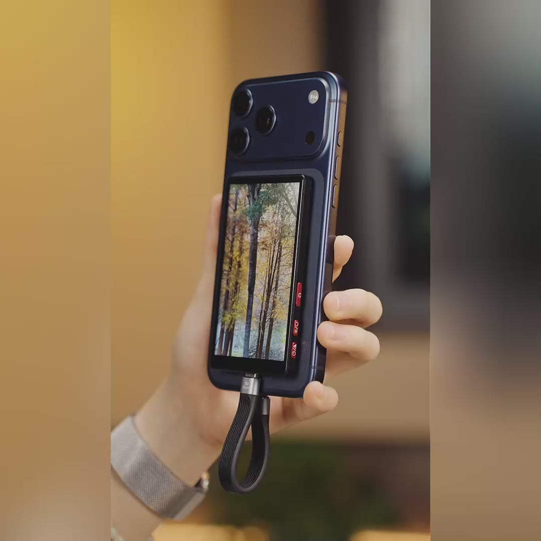 Einfaches und unterbrechungsfreies Audio- Der Selfie Monitor wird über ein USB C Kabel für Echtzeit Telefon Spiegelung angeschlossen und sorgt mit bis zu 600 Nits für eine klare Anzeige. Alle Audiofunktionen des Telefons bleiben erhalten, sodass Sie Anrufe entgegennehmen oder Musik abspielen können, ohne die Aufnahme zu unterbrechen. Mit einer Dicke von nur 0,2 Zoll und einem Gewicht von 2,5 Unzen ist das ultradünne Metallgehäuse tragbar und vermittelt ein hochwertiges Gefühl
