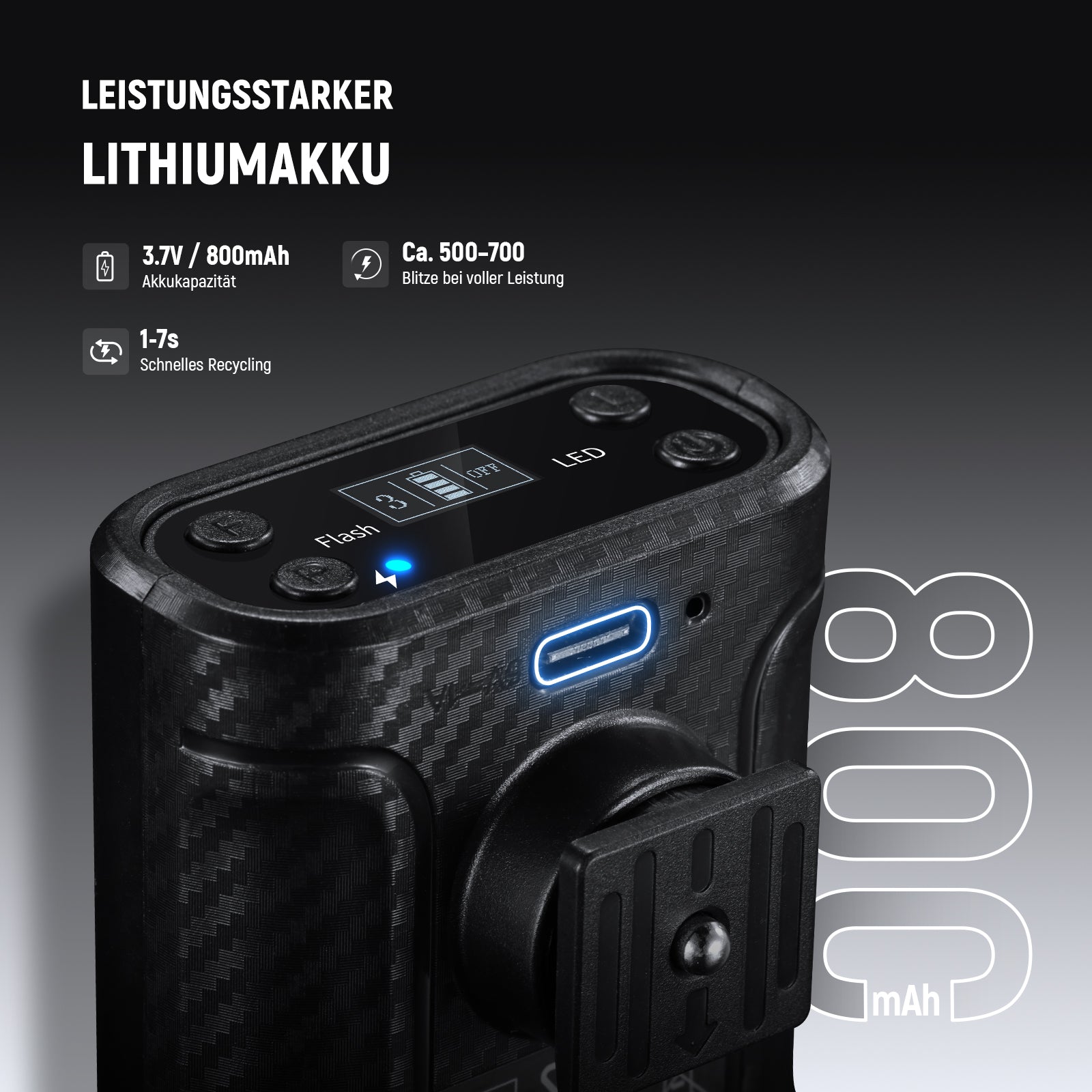 • 8 Optionen für Blitzausgänge mit 800mAh Akku- 8 wählbare Leistungsstufen, einfache Einstellung der Blitzintensität im Bereich von 1/1 bis 1/128. Ob Sie nun sanftes Licht oder hohe Lichtleistung benötigen, Sie können das Licht vollständig steuern, um es an Ihre Szenerie und Ihre kreativen Bedürfnisse anzupassen. Mit integrierten 800mAh Akku, der 500 bis 700 Blitze ermöglicht, ist dieses Blitzgerät ideal für mobile Fotografie, da es auch bei längeren Aufnahmen nicht häufig aufgeladen werden muss