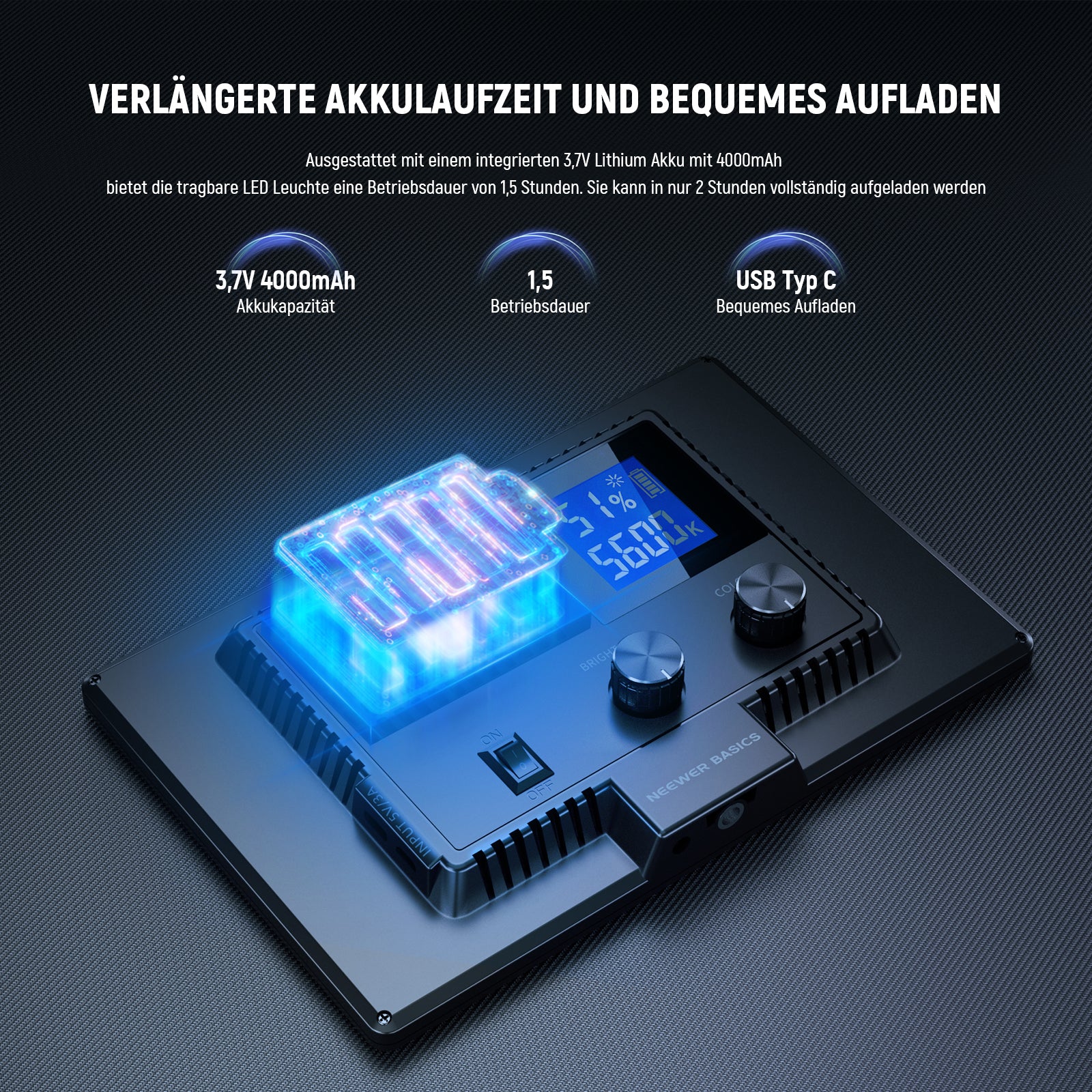 - Verlängerte Akkulaufzeit und bequemes Aufladen- Ausgestattet mit einem integrierten 3,7V Lithium Akku mit 4000mAh bietet die tragbare LED Video Light für die Fotografie eine Leuchtdauer von 1,5 Stunden. Sie kann in nur 2 Stunden vollständig aufgeladen werden und unterstützt sowohl Typ C als auch USB Anschlüsse für ein problemloses Aufladen. Ein USB Typ C Ladekabel ist für zusätzlichen Komfort im Lieferumfang enthalten