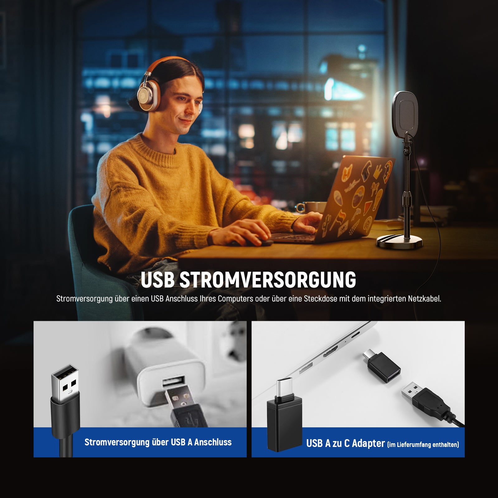 • 5 CCT Einstellungen und 10 Dimmstufen- Diese Streaminglicht verfügt über 120 Hochleistungs LEDs (60 warme und 60 kühle) für bis zu 656 Lux/0,5m und bietet 5 Farbtemperaturstufen von 3000K bis 65000K sowie 10 Helligkeitsstufen, um allen Hauttönen gerecht zu werden und verschiedenen Beleuchtungsanforderungen gerecht zu werden. Die Speicherfunktion ruft automatisch die zuletzt verwendeten Einstellungen für Farbtemperatur und Helligkeit ab. Ein USB A zu USB C Adapter ist enthalten