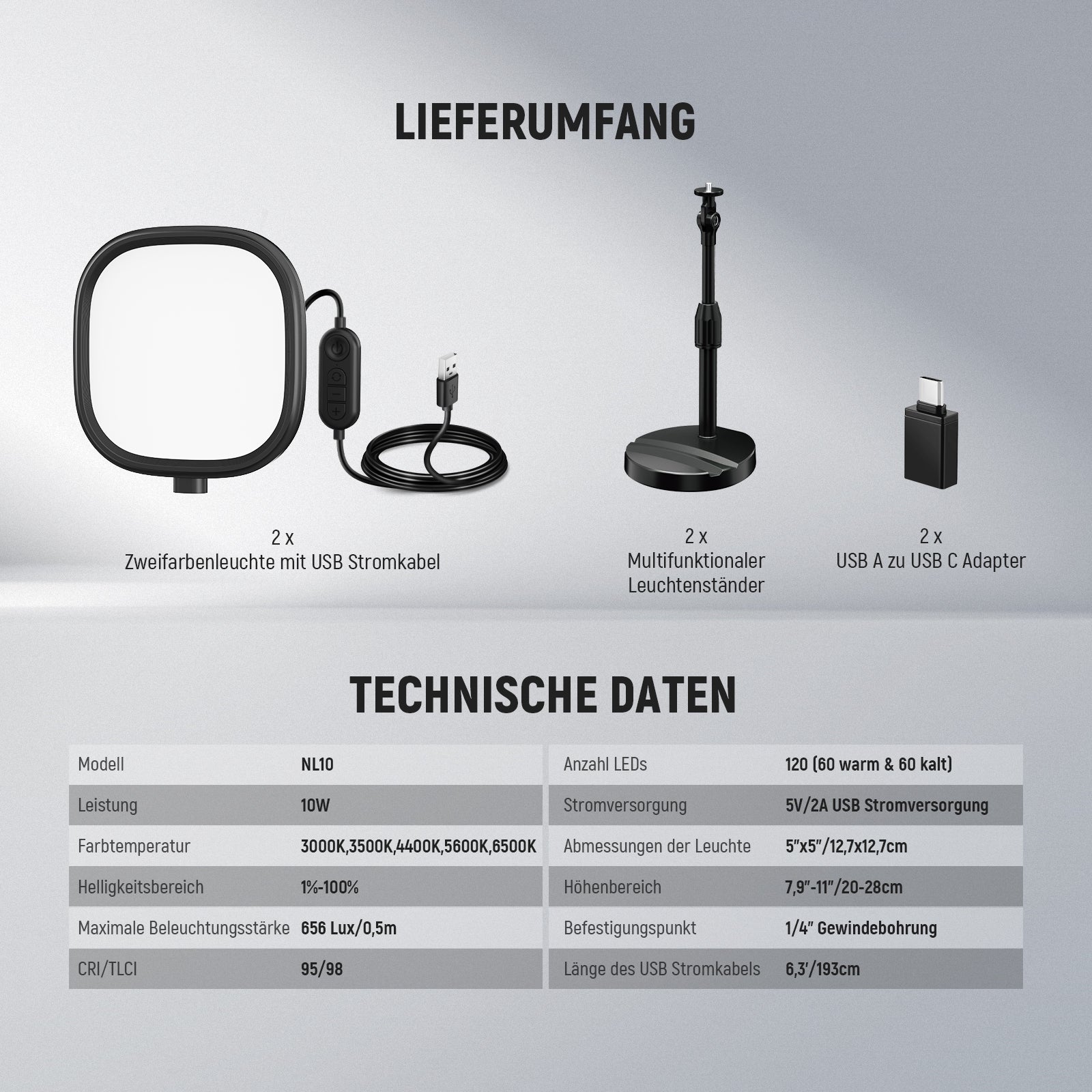 • Einführung von NEEWER BASICS- NEEWER BASICS ist eine einfache und praktische Produktreihe, die sich auf wesentliche Funktionen und Designs konzentriert, ohne unnötige Extras und Materialien. Das LED Tisch Ringlight arbeitet mit 5V/2A und verfügt über ein integriertes 193 cm langes Netzkabel, das bequem über Displays Laptops tragbare Ladegeräte oder andere USB Stromquellen mit Strom versorgt wird und flexible Stromversorgungslösungen, Selfies mit dem Handy und das tägliche Dauerlicht bietet