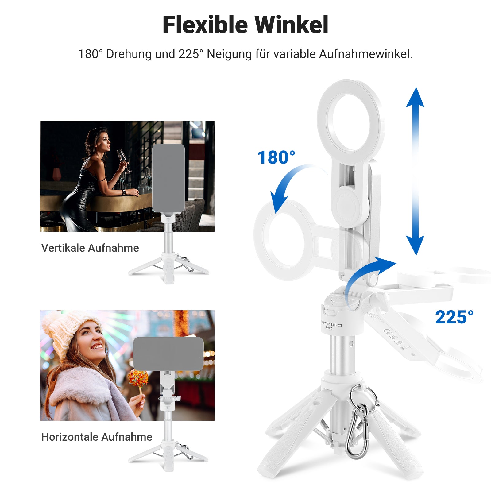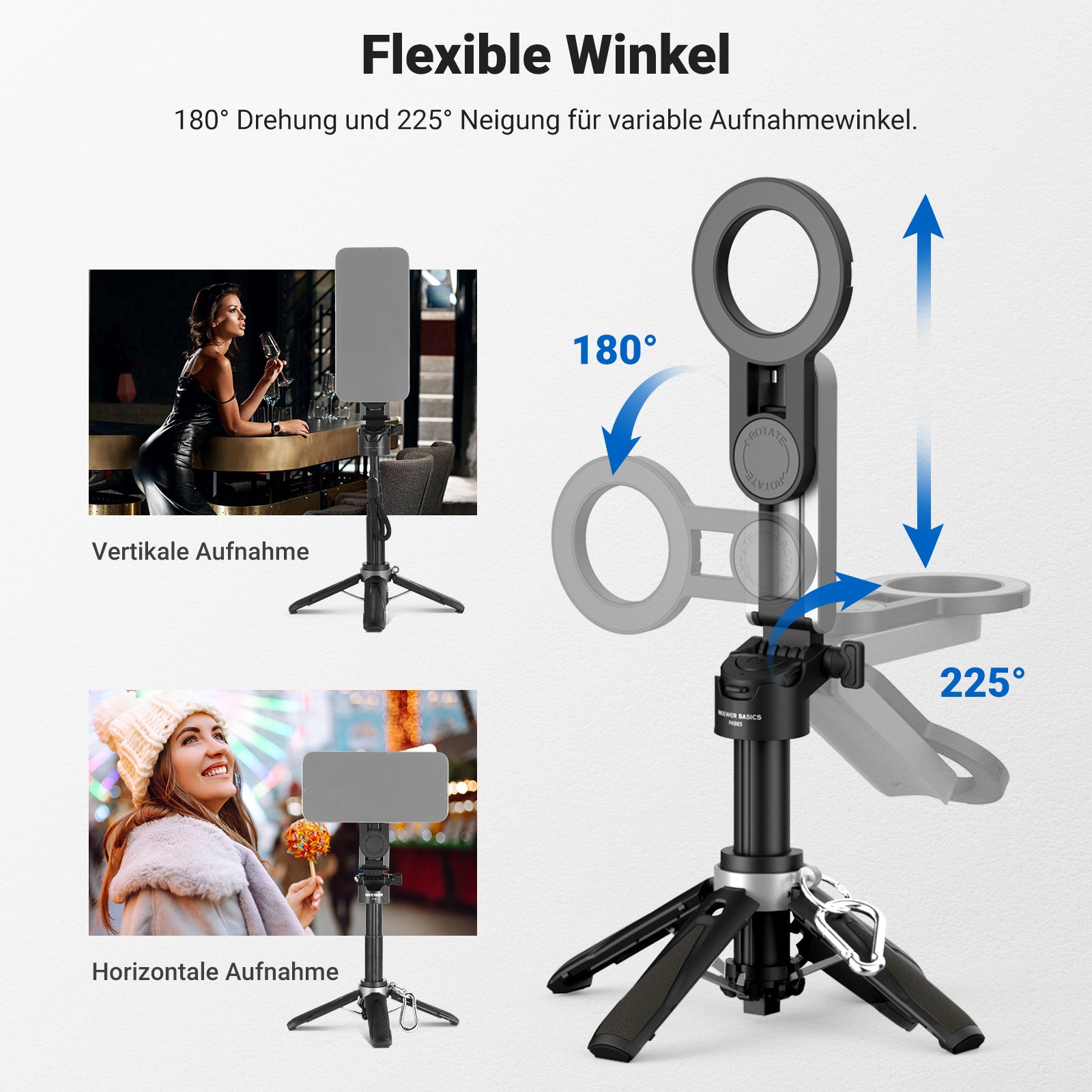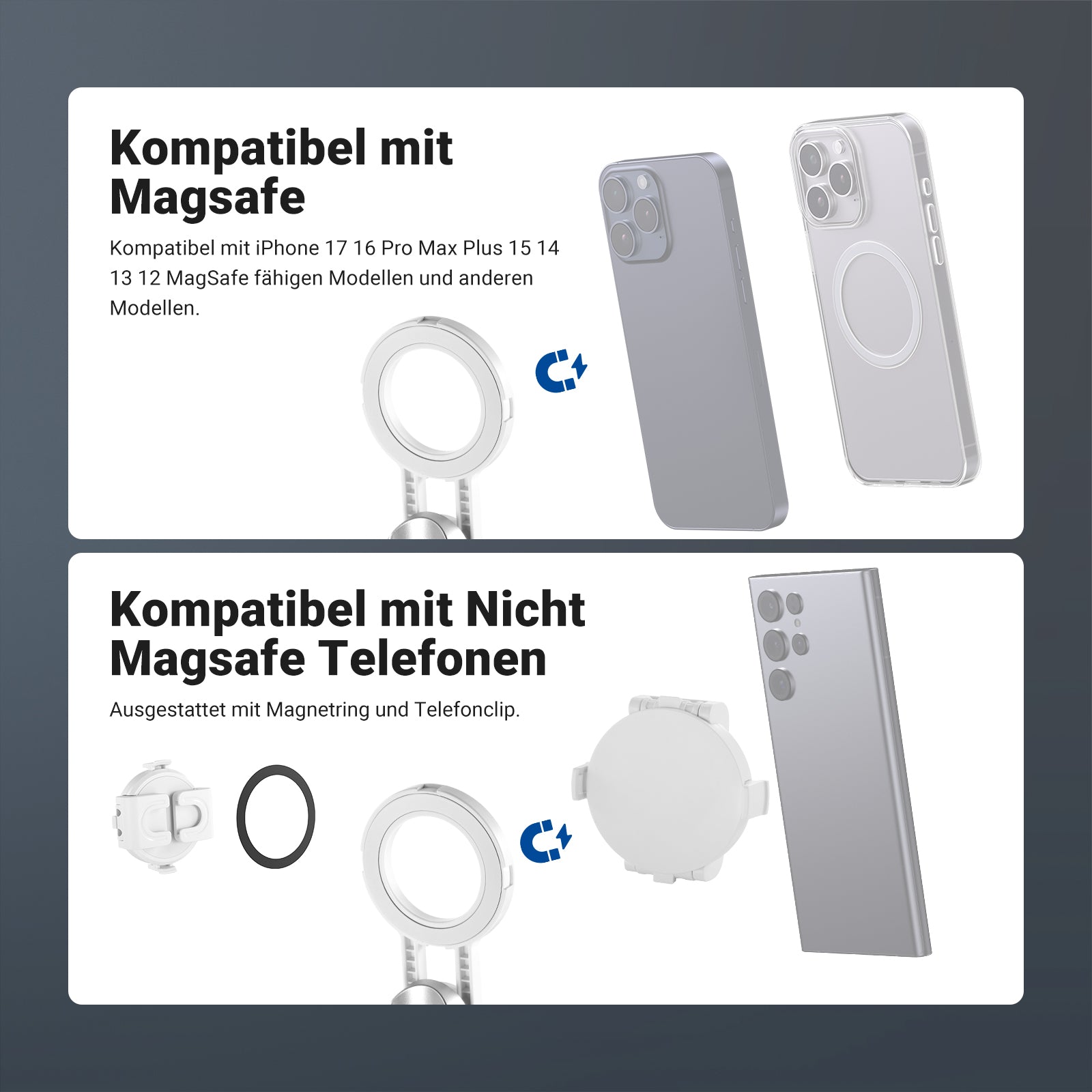 - Magnetbefestigung und Phone Clip Holder enthalten- Das kompakte Mini Tripod Stand ist kompatibel mit MagSafe iPhone iPhone 16 i Phone 15 Pro Max Plus 14 13 12 sowie mit MagSafe kompatiblen Handyhüllen und NEEWER PA073 PA074 PA023 PA024 Käfigen. Für Nicht MagSafe Handy verwenden Sie den mitgelieferten Magnetring oder die Handy Kamera Phone Holder, um das kleine Stativ Ständer mit Samsung Galaxy S25 S24 S23 Ultra Google Pixel 9 Pro Huawei und weiteren als Zubehör für die Telefonkamera zu verwenden