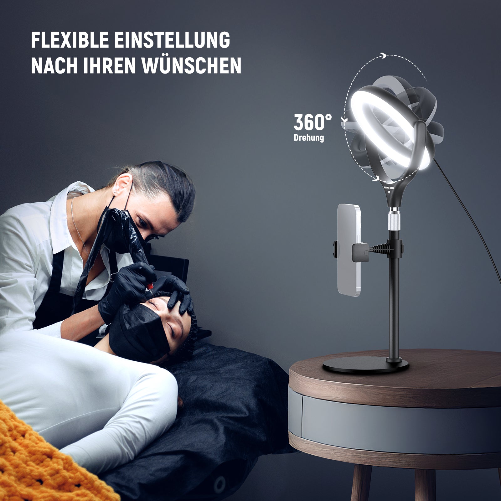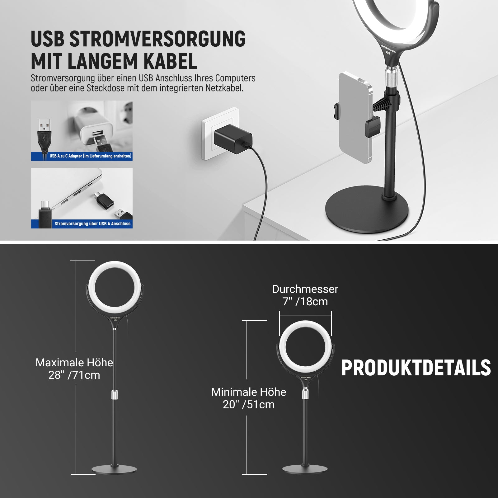 • Flexible Positionierung- Das Ringleuchte mit Selfie Handyhalterung und Tischständer lässt sich auf eine Höhe von bis zu 28 Zoll ausziehen und um 360° nach vorne und hinten drehen. Ideale Videoleuchte für Computerbildschirm Webcam, Laptop Zoom Meetings, Videokonferenzen, Videoanrufe im Homeoffice, FaceTime, Podcasts, Visagisten, Selfies usw.