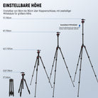 - Schnelle und einfache Einstellung- Stellen Sie die Höhe mühelos von 48cm bis 133cm ein und verwenden Sie die zweiteilige Mittelsäule für eine Verlängerung auf bis zu 182cm. Die Mittelsäule kann auch umgedreht werden, um Makroaufnahmen zu machen. Der Gewichts Haken und die rutschfesten Gummifüße sorgen für zusätzliche Stabilität auf unterschiedlichem Terrain. Außerdem können Sie die Beinwinkel schnell auf eine von drei voreingestellten Positionen einstellen, indem Sie die Beinschlösser drücken