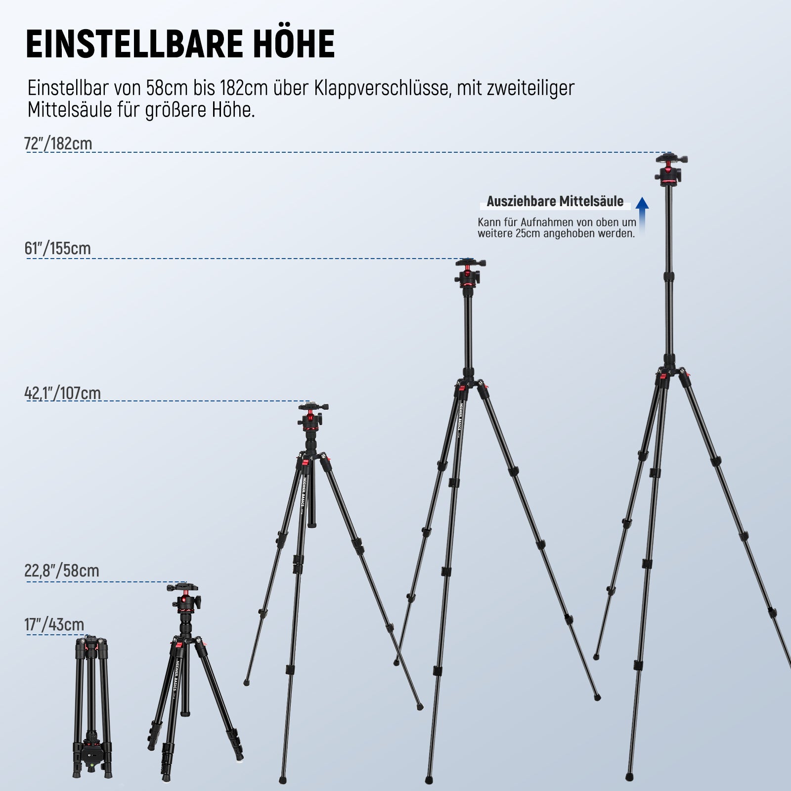 - Höhe: 19" (48 cm) bis 72" (182 cm)