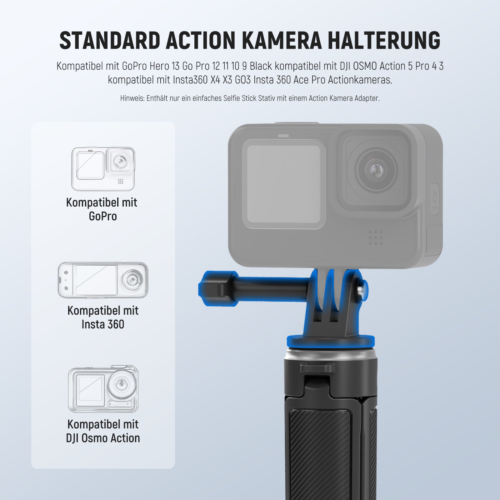 - Mini Selfie Stick Tischstativ- Fahren Sie den Selfie Stick vollständig aus, um ihn als Tischstativ zu verwenden, oder halten Sie ihn in der Hand als stabilisierenden Griff, um schnell zwischen Griff und Standmodus zu wechseln. Das aus einer hochwertigen Aluminiumlegierung gefertigte kleine Taschenkamerastativ unterstützt Ihre Action Kamera oder Ihr Smartphone (nur Action Kamera Adapter enthalten) und ist ideal für Vlog, Live Streaming, Videoaufnahmen, Film usw. Max. Belastung 1,1lb/500g