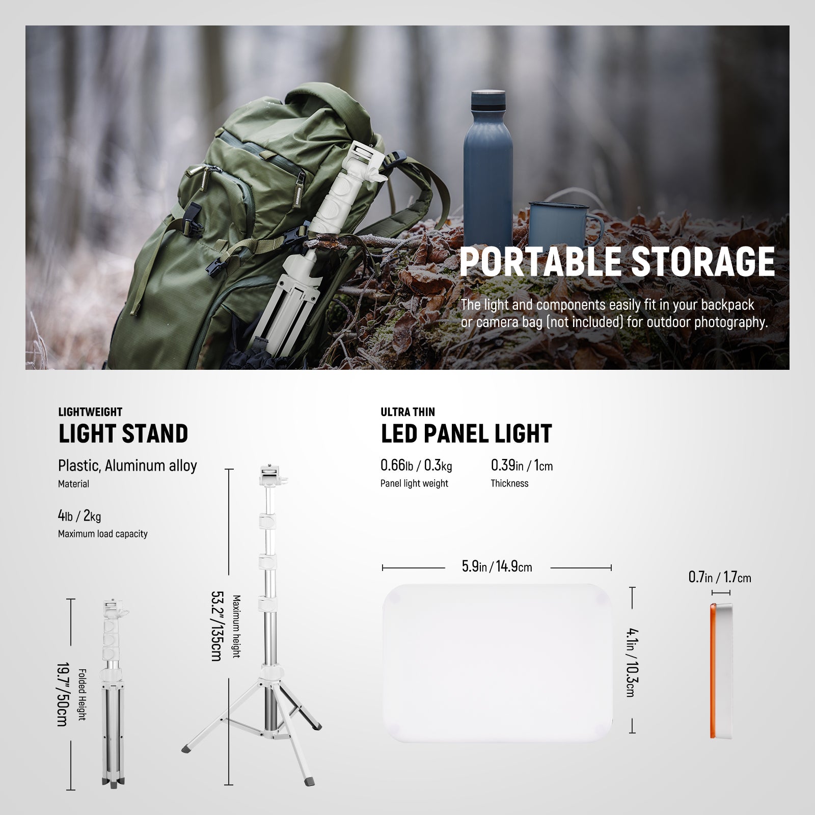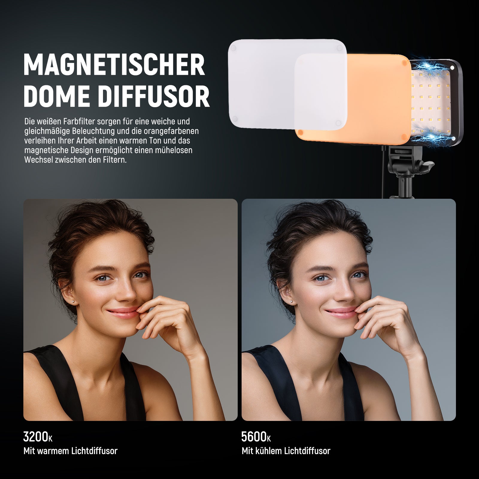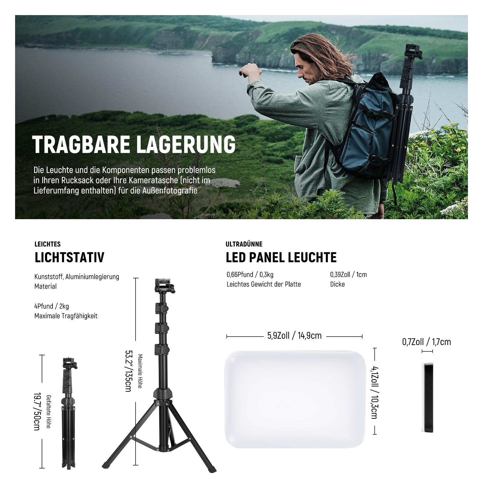 Kompakt und tragbar- Das LED Studiolicht ist mit nur 177g leicht und kompakt (149 x 103 x 17mm), tragbar und einfach als Hauptlicht oder Fülllicht für das Streamen, Fotografieren und die Videografie unterwegs zu tragen