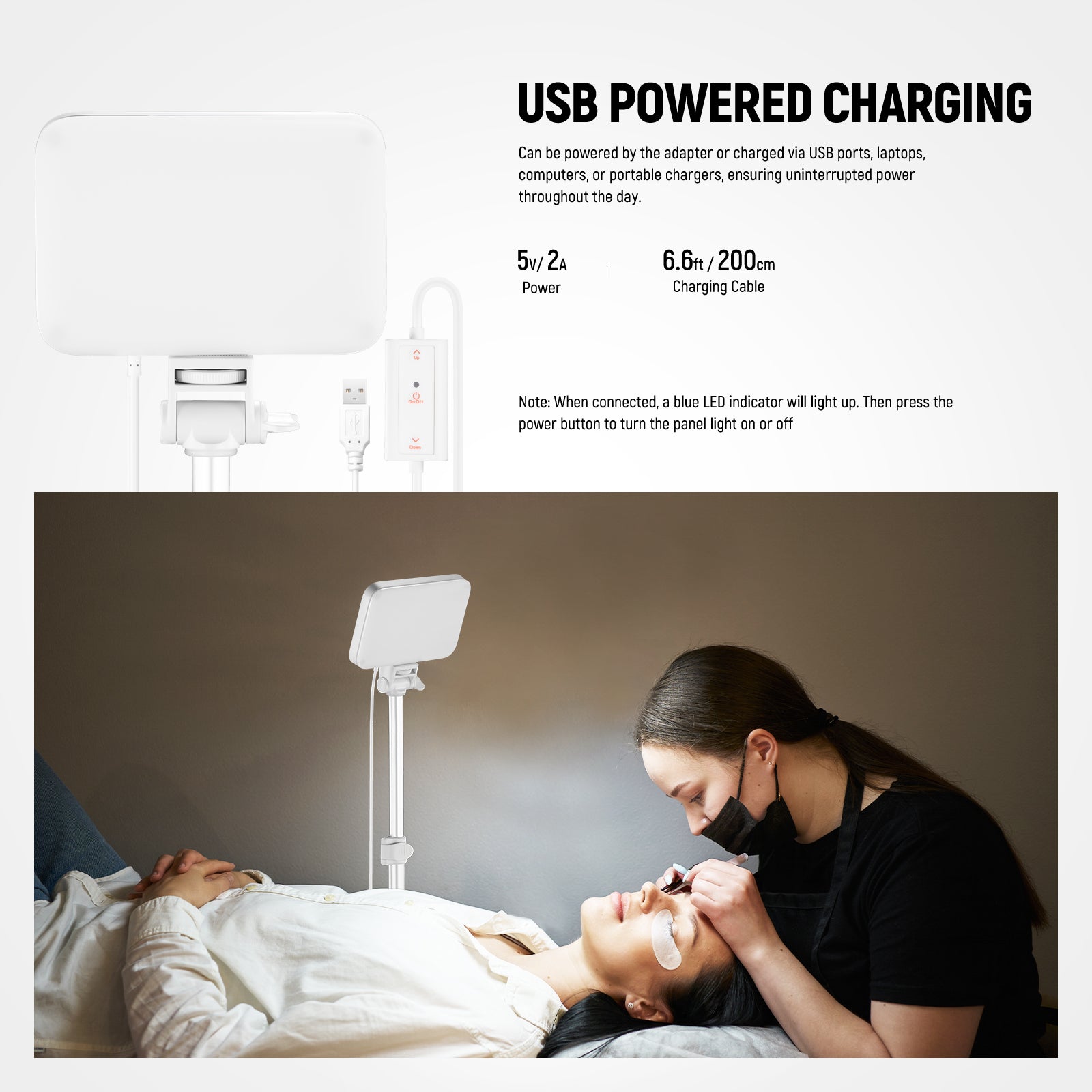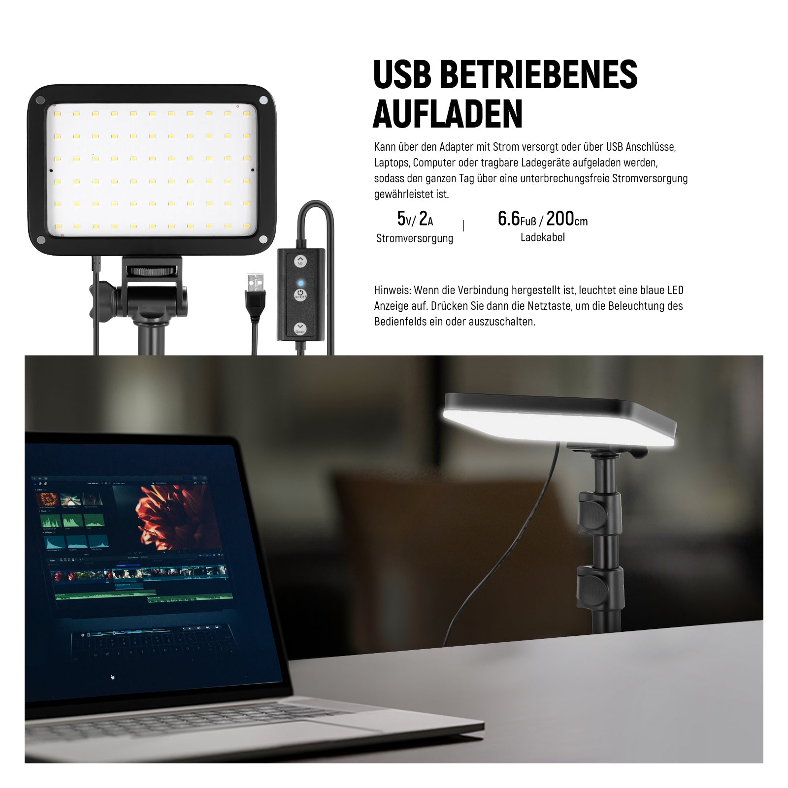 - Aufladen über USB- Das Handy Selfie Licht für den Schreibtisch arbeitet mit 5V/2A, mit einem eingebauten 2m Ladekabel, kann über den Adapter oder über USB Anschluss Displays, Laptops, Computer oder tragbare Ladegeräte aufgeladen werden, was eine ununterbrochene Stromversorgung während des ganzen Tages gewährleistet. Hinweis: Wenn die Verbindung hergestellt ist, leuchtet eine blaue LED Anzeige auf. Drücken Sie dann die Einschalttaste, um das Panellicht ein oder auszuschalten