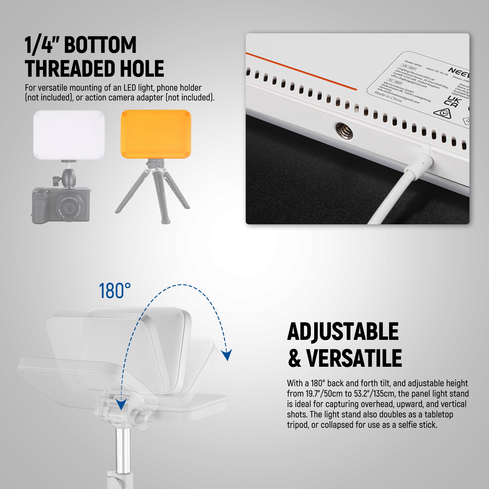 Einstellbare Höhe & Winkel, Vielseitig- Mit 180° einem Neigungswinkel und einem einstellbaren Höhenbereich von 50-135cm ist das Studiolicht Lichtstativ ideal für Aufnahmen von oben, nach oben, vertikal. Es kann als Tischstativ verwendet und für den mobilen Einsatz zu einem Selfie Stick zusammengeklappt werden. Die 1/4" Schraube an der Oberseite ermöglicht die Befestigung von verschiedenem Fotozubehör wie LED Fotolicht, Handyhalterungen (NICHT enthalten), Action Kamera Adapter (NICHT enthalten)