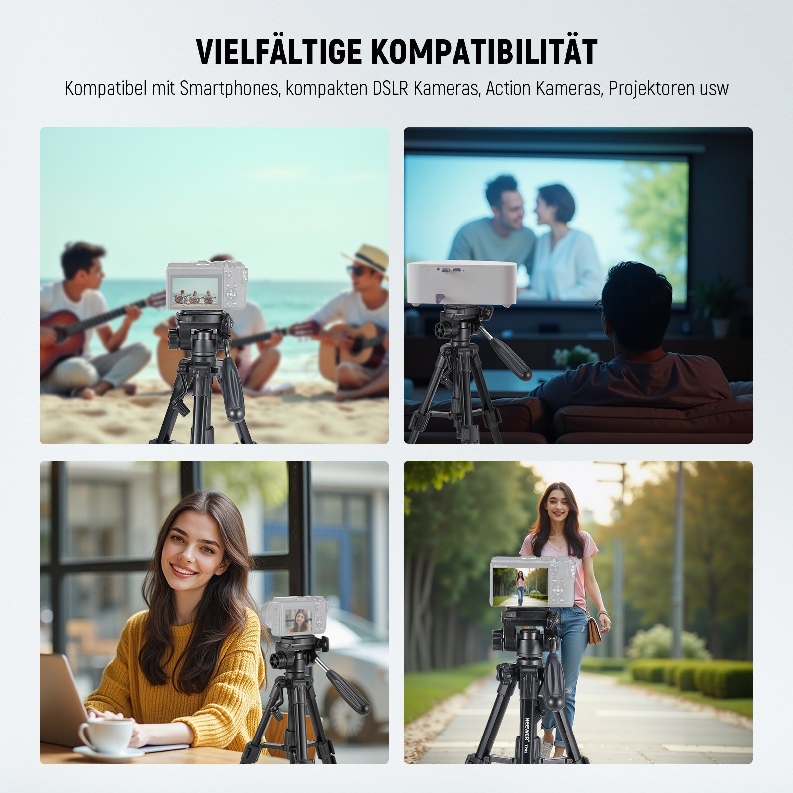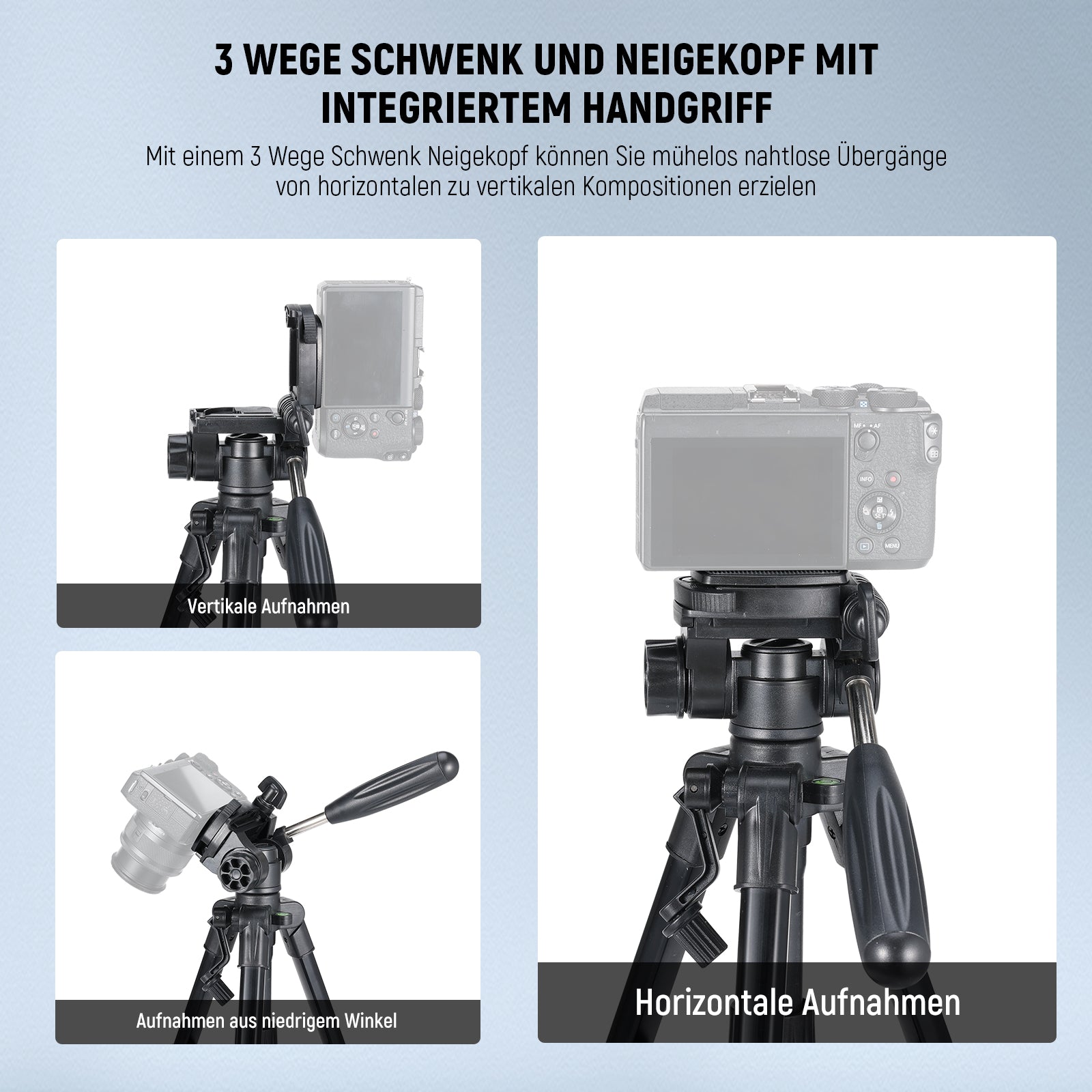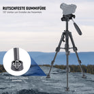 - 3 Wege Schwenk Neigekopf und eingebauter Griff- Mit einem 3 Wege Schwenk Neigekopf können Sie mühelos nahtlose Übergänge von horizontalen zu vertikalen Kompositionen erzielen. Der eingebaute Griff und die Wasserwaage sorgen für eine schnelle und einfache Einstellung, während die um 720° drehbaren, rutschfesten Gummifüße für Stabilität auf jedem Untergrund sorgen