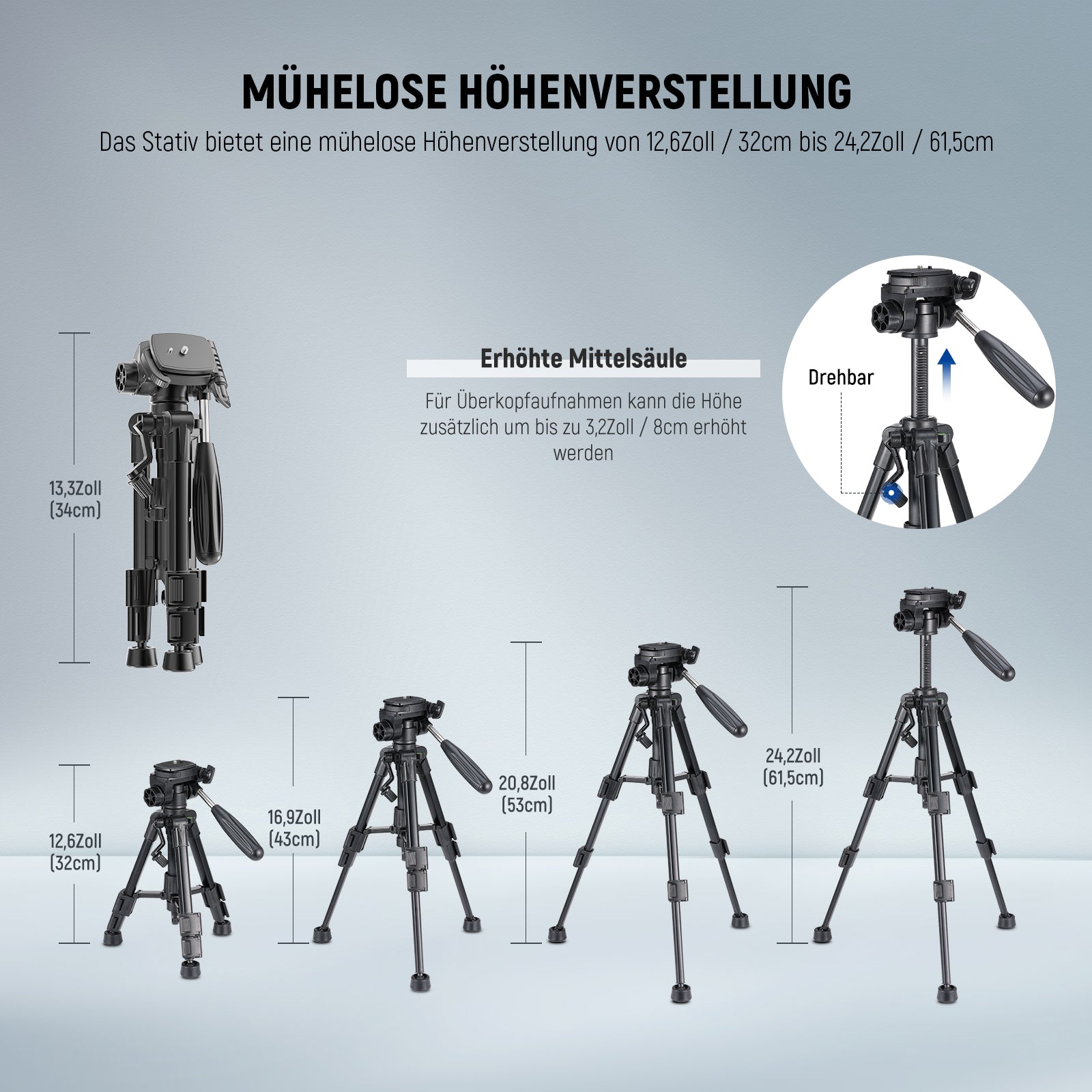- Mühelose Höhenverstellung und erhöhte Mittelsäule- Das ministativ bietet mit seinem vielseitigen Design eine mühelose Höhenverstellung. Die 3 teiligen Beine können mit Hilfe von Schnappverschlüssen leicht von 9,8"/25cm bis 18,9"/48cm verstellt werden, während die Mittelsäule zusätzlich bis zu 3,2"/8cm erhöht werden kann. Mit einem Gesamthöhenbereich von 12,6"~24,2"/32~61,5cm bietet dieses Mini Tripod Flexibilität, um in jeder Situation die perfekte Aufnahme zu machen