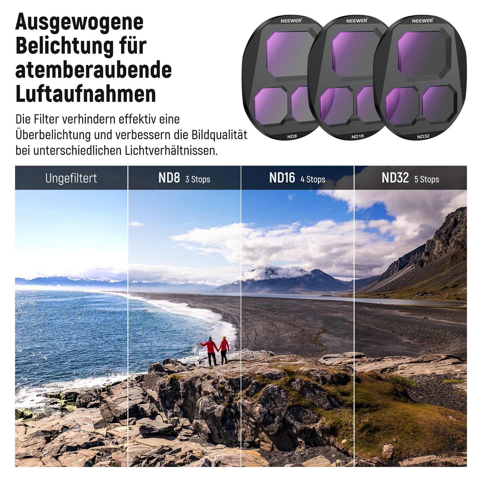 - Präzise Belichtungssteuerung- Die Filter ND8, ND16 und ND32 reduzieren das Licht um jeweils 3, 4 und 5 Stops. Die Filter ND16, ND64 und ND256 reduzieren das Licht um jeweils 4, 6 und 8 Stops. Diese Filter verhindern effektiv Überbelichtung in hellen Umgebungen und verleihen Ihren Aufnahmen einen dynamischen Bewegungsunschärfe Effekt