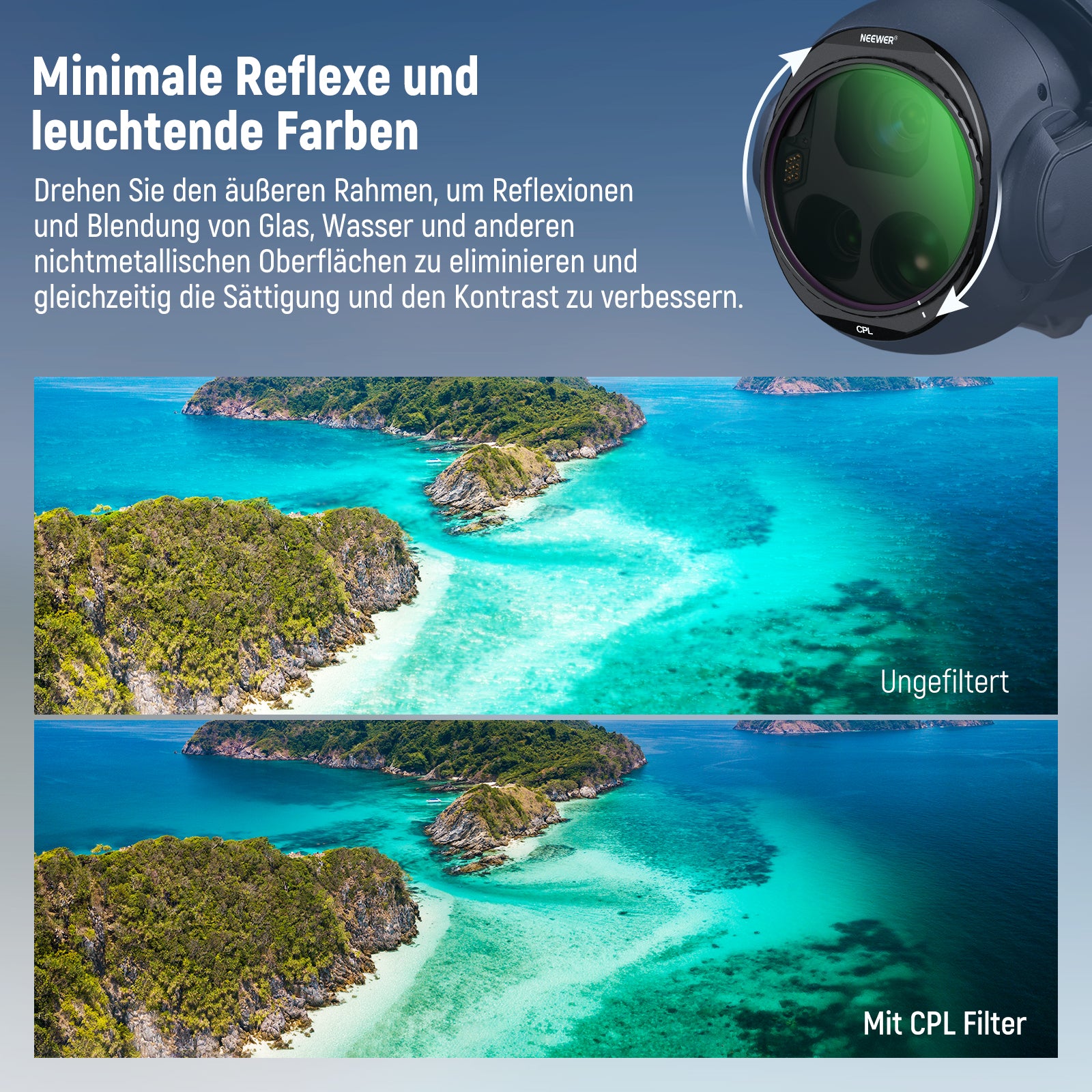 - Weniger Reflexe und intensivere Farben- Der zirkulare Polarisationsfilter kann Reflexionen und Spiegelungen von Wasser, Glas und anderen nichtmetallischen Oberflächen eliminieren und gleichzeitig die Sättigung und den Kontrast für lebendige Farben und feine Details verbessern. Drehen Sie den Filterrahmen, um mühelos den gewünschten Effekt zu erzielen