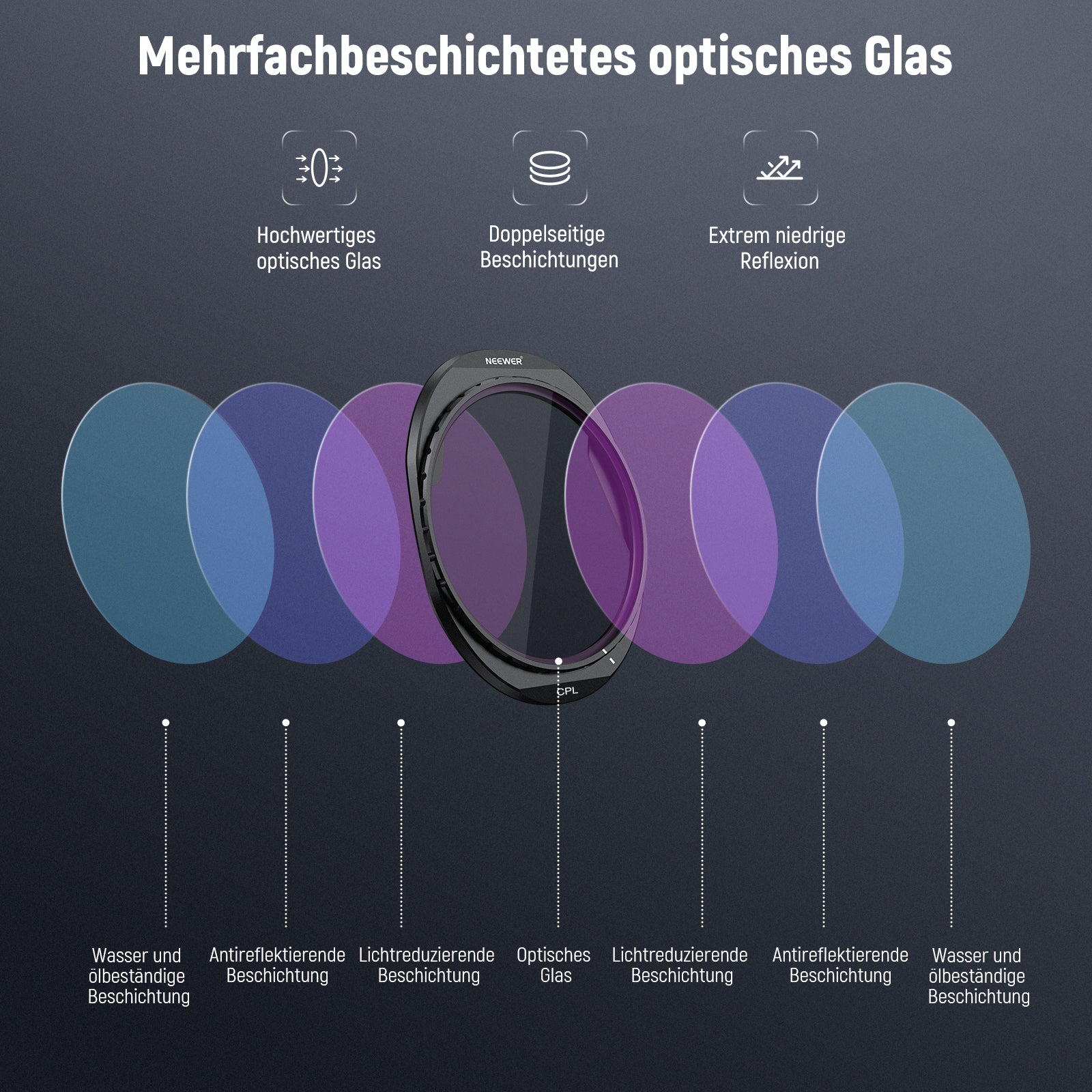 - Mehrfach vergütetes optisches Glas- Optisches Glas gewährleistet präzise Farbwiedergabe und optimierte Bildschärfe. Mehrfache Schutzschichten widerstehen Wasser, Staub, Fingerabdrücken, Kratzern und reduzieren Reflexionen. Ein Reinigungstuch ist enthalten, um Ihnen zu helfen, die Filter makellos zu halten