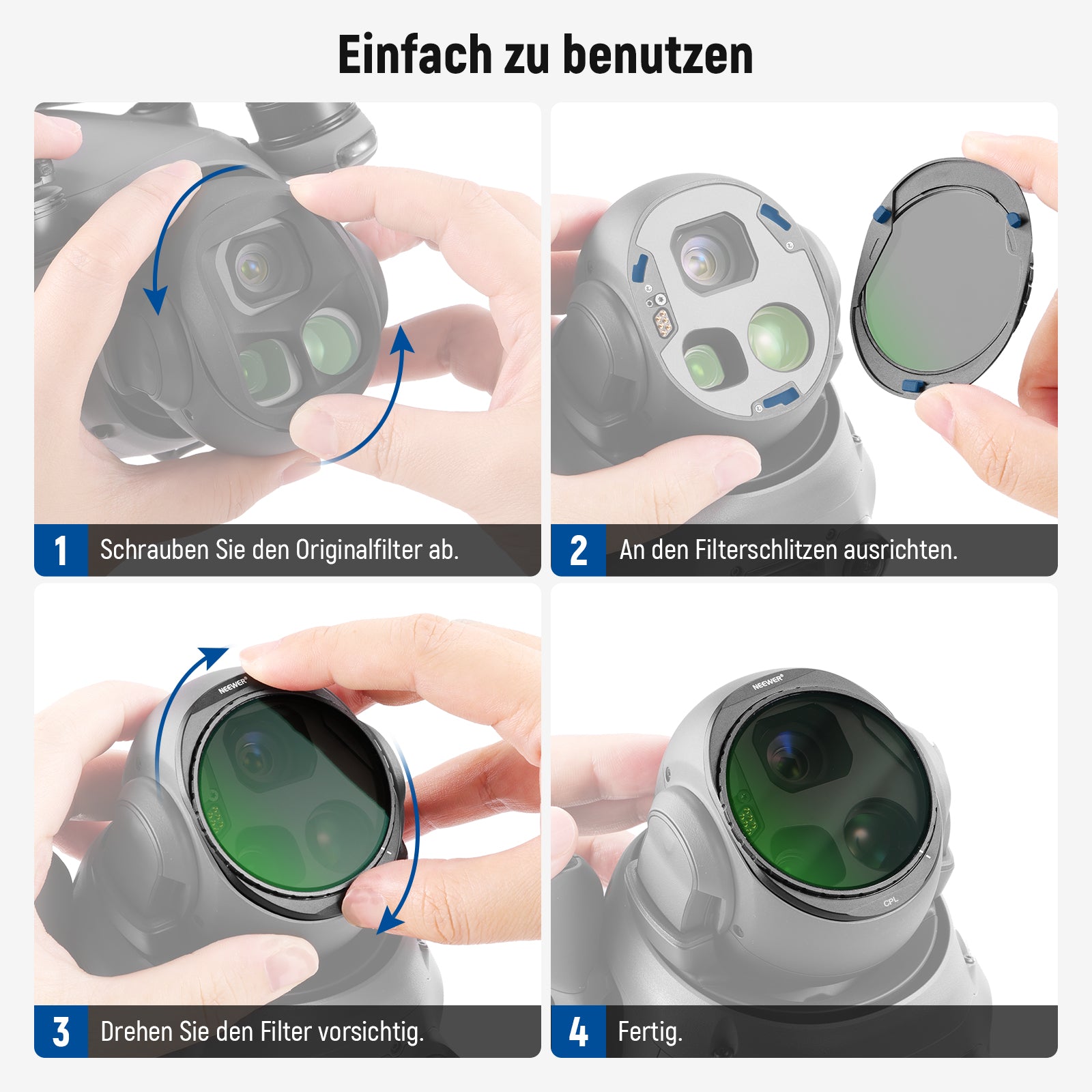 Einfache Montage durch Anschrauben- (1) Drehen Sie die Original Schutzabdeckung vorsichtig gegen den Uhrzeigersinn ab. (2) Richten Sie den Filter an den Befestigungsschlitzen aus und drehen Sie ihn im Uhrzeigersinn, bis er einrastet. Mit einem Gewicht von 0,2Unzen / 5g beeinträchtigt der leichte Filter mit einem Rahmen aus Aluminiumlegierung weder die Balance noch die Leistung des Gimbals