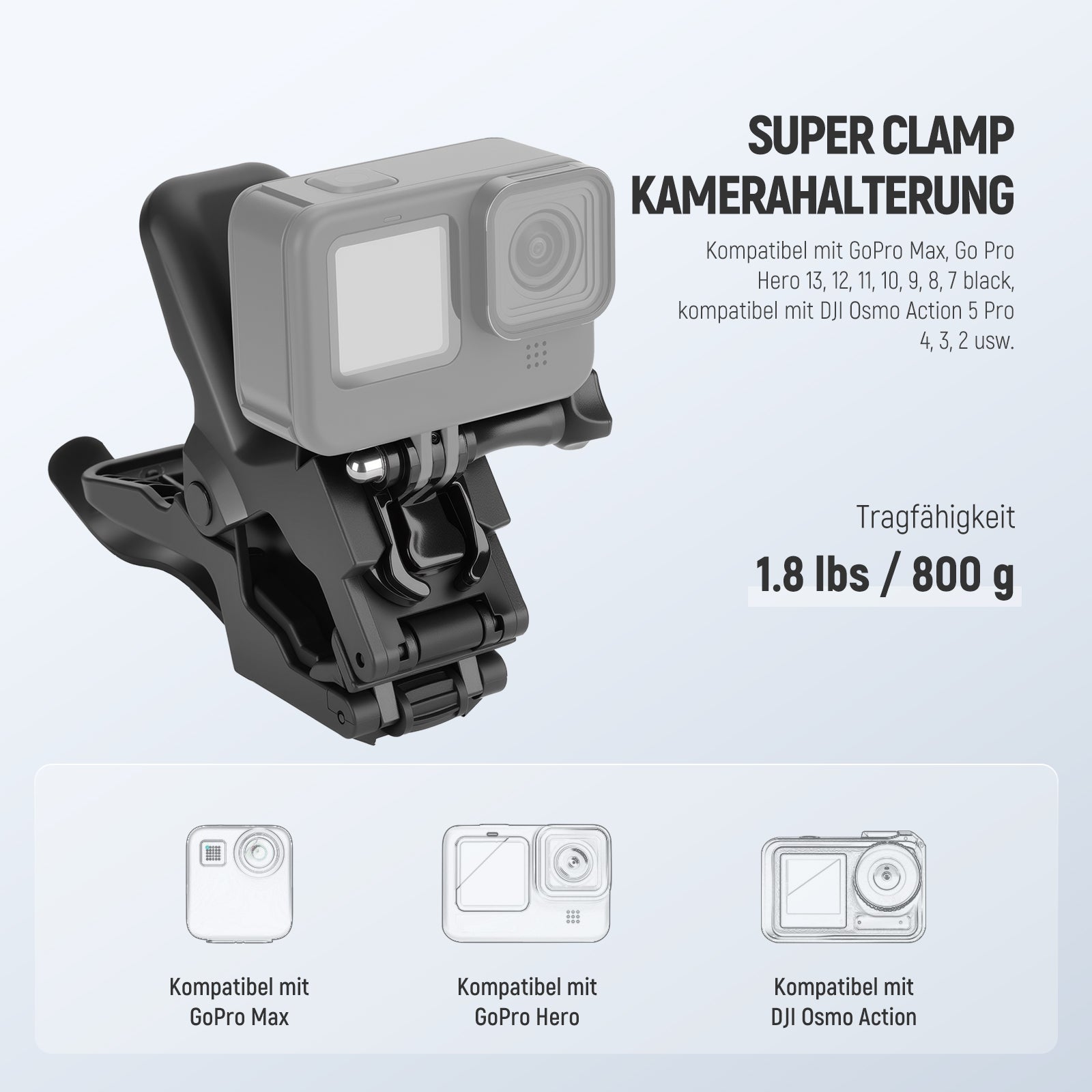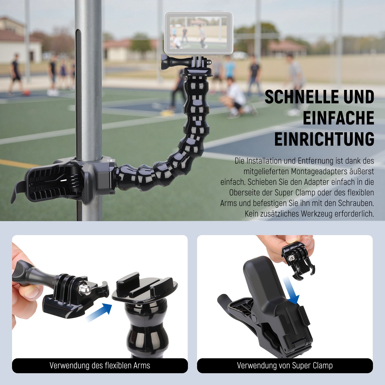 - Super Clamp Kamerahalterung- Montieren Sie Ihre Actionkamera ganz einfach an einem beliebigen Ort mit einer Super Klemme oder einem flexiblen Arm, sodass Sie die Aufregung Ihres Lebens jederzeit und überall festhalten können, kompatibel mit GoPro Max go pro Hero 13 12 11 10 9 8 7 Black kompatibel mit DJI Osmo Action 5 Pro 4 3 2 und mehr, ideales Zubehörset für Überkopfaufnahmen, Außenfotografie, Vlogging, Live Streaming, Videoaufzeichnung und andere Videografie. Maximale Belastung 800g