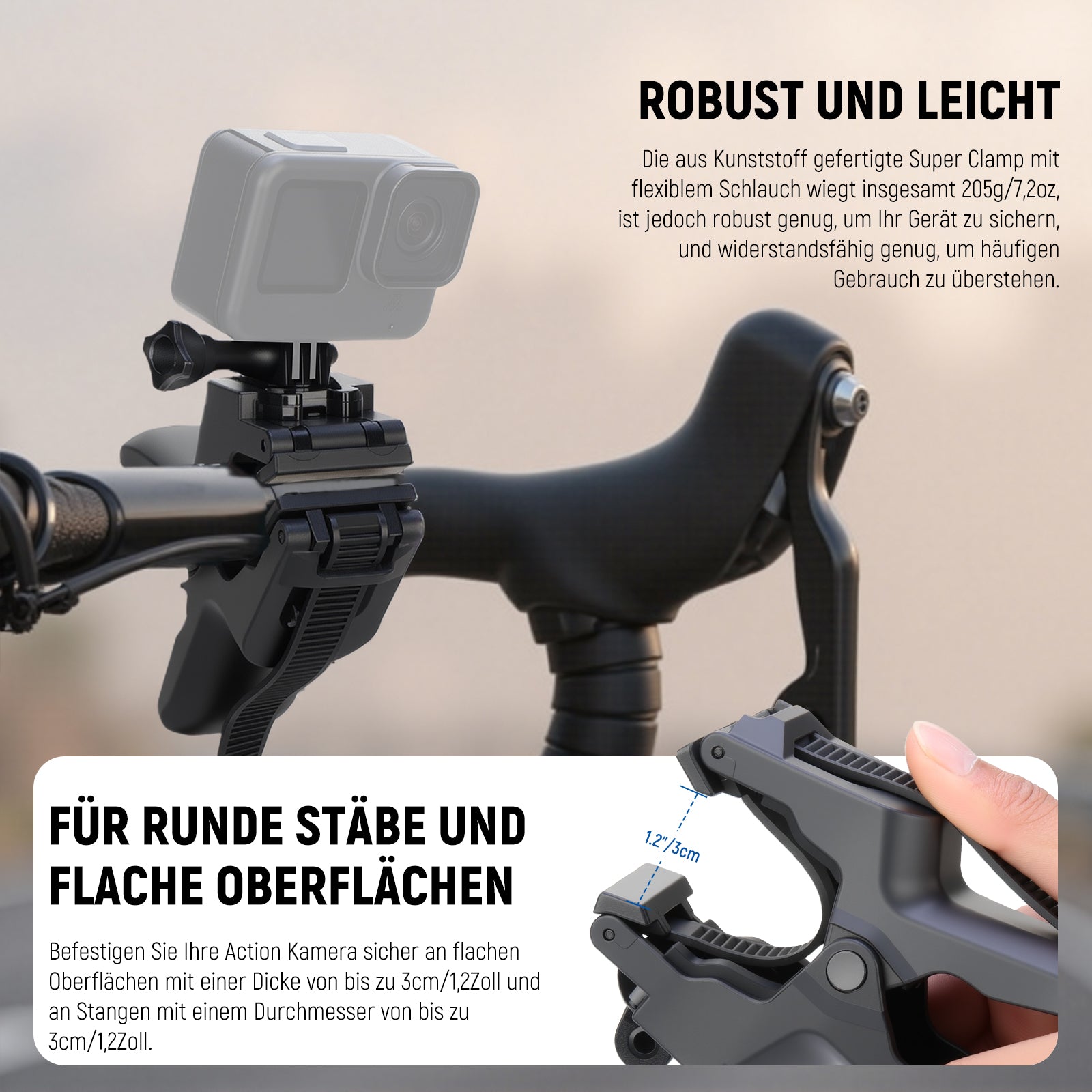 - Für runde Stangen und flache Oberflächen- Die Super Clamp hält sicher auf flachen Oberflächen mit einer Dicke von bis zu 3cm und Stangen mit einem Durchmesser von bis zu 3cm und eignet sich hervorragend für Querstangen, Fahrradlenker, Zäune, Stativbeine, Lichtstative, Schulterhalterungen und mehr. Die rutschfesten Gummipads erhöhen die Stabilität und schützen die Oberflächen vor Kratzern. Ein unverzichtbares Zubehör für Content Creator und ein Muss für Influencer in der Actionkamera Fotografie