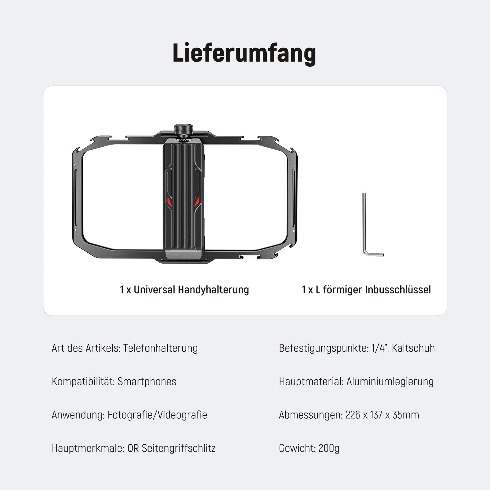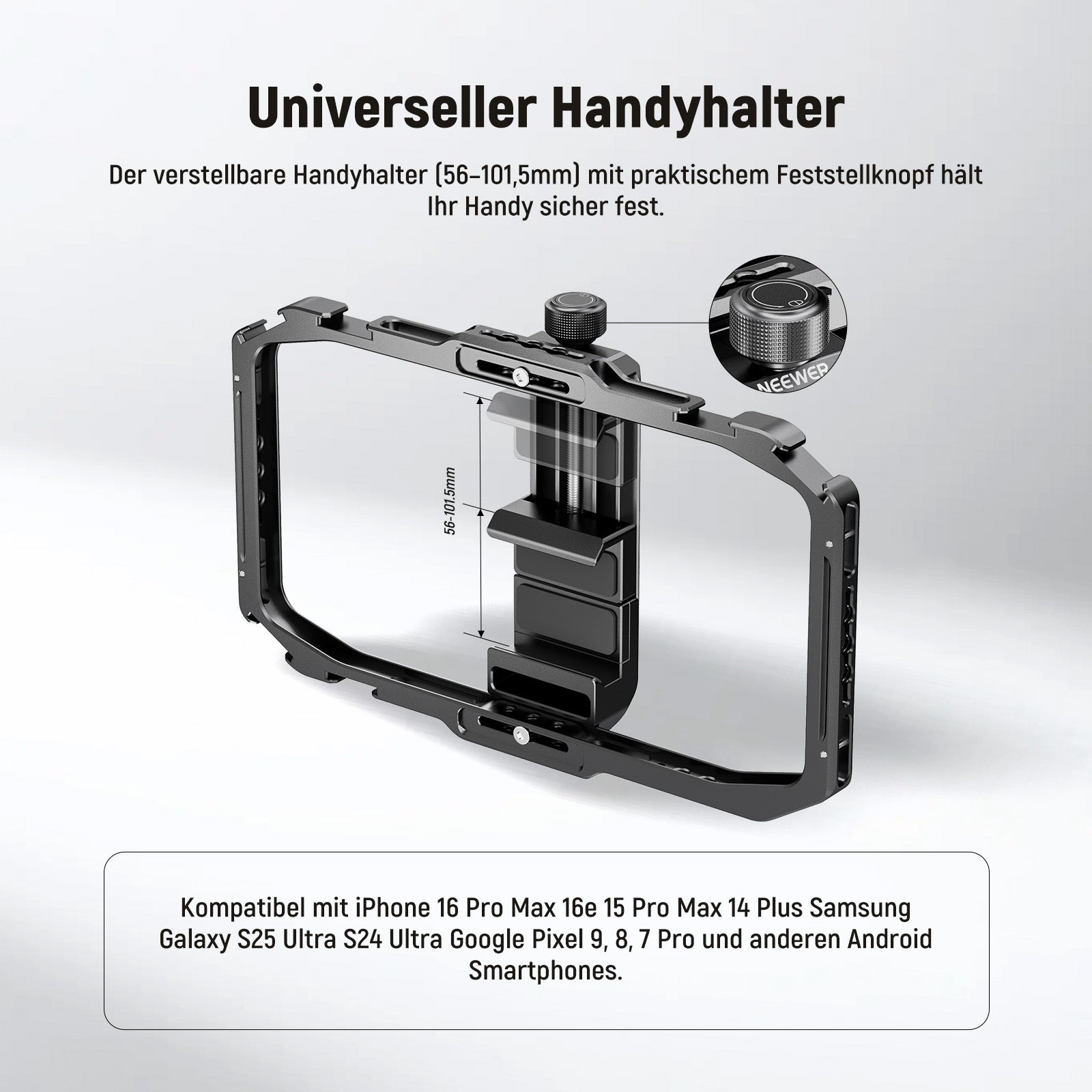 - Universelle Handy Kamera Käfig Rig- Der einstellbare Smartphone-Halter (56-101,5mm / 2,2"-4") mit praktischem Verriegelungsdrehknopf hält Ihr Telefon sicher, kompatibel mit iPhone 17 16 Pro Max/16/15 Pro Max/14 Plus Samsung Galaxy S25 Ultra/S24 Ultra Google Pixel 9/8/7 Pro und anderen Android Smartphones. Ein Muss für Content Creator als essenzielles Stabilisator Zubehör für Fotografie und Videografie, perfekte Ausrüstung für Videoproduzenten und Influencer