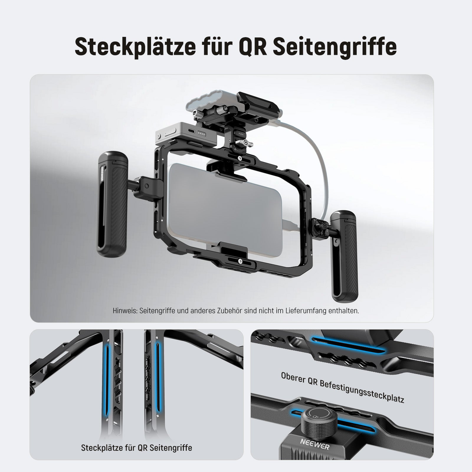 - Aufnahmen für QR Seitengriffe- Vier Seiten dieses Käfigs verfügen über spezielle Aufnahmen für NEEWER PA045B/PA045S/PA045E Schnellverschluss Seitengriffe und anderes Zubehör mit demselben Befestigungssystem, einschließlich PA065 Schnellverschluss SSD Halter. Hinweis: Seitengriffe und anderes Zubehör sind nicht im Lieferumfang enthalten