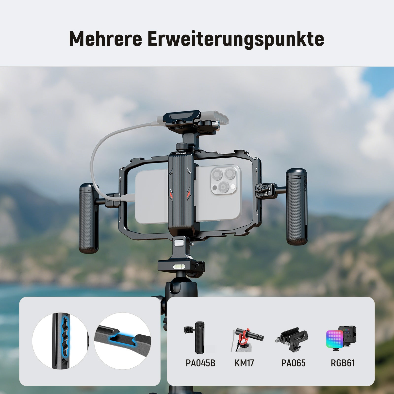 - Mehrere Erweiterungspunkte- Kaltblitzschuh Aufnahmen für KM17 Plug & Play Mikrofon, RGB61 LED Licht und PS020E USB C Hub Dock. 1/4" Gewinde ermöglichen vertikale oder horizontale Verbindung des Käfigs mit Stativ, Tischstativ, Einbeinstativ und Handgriff