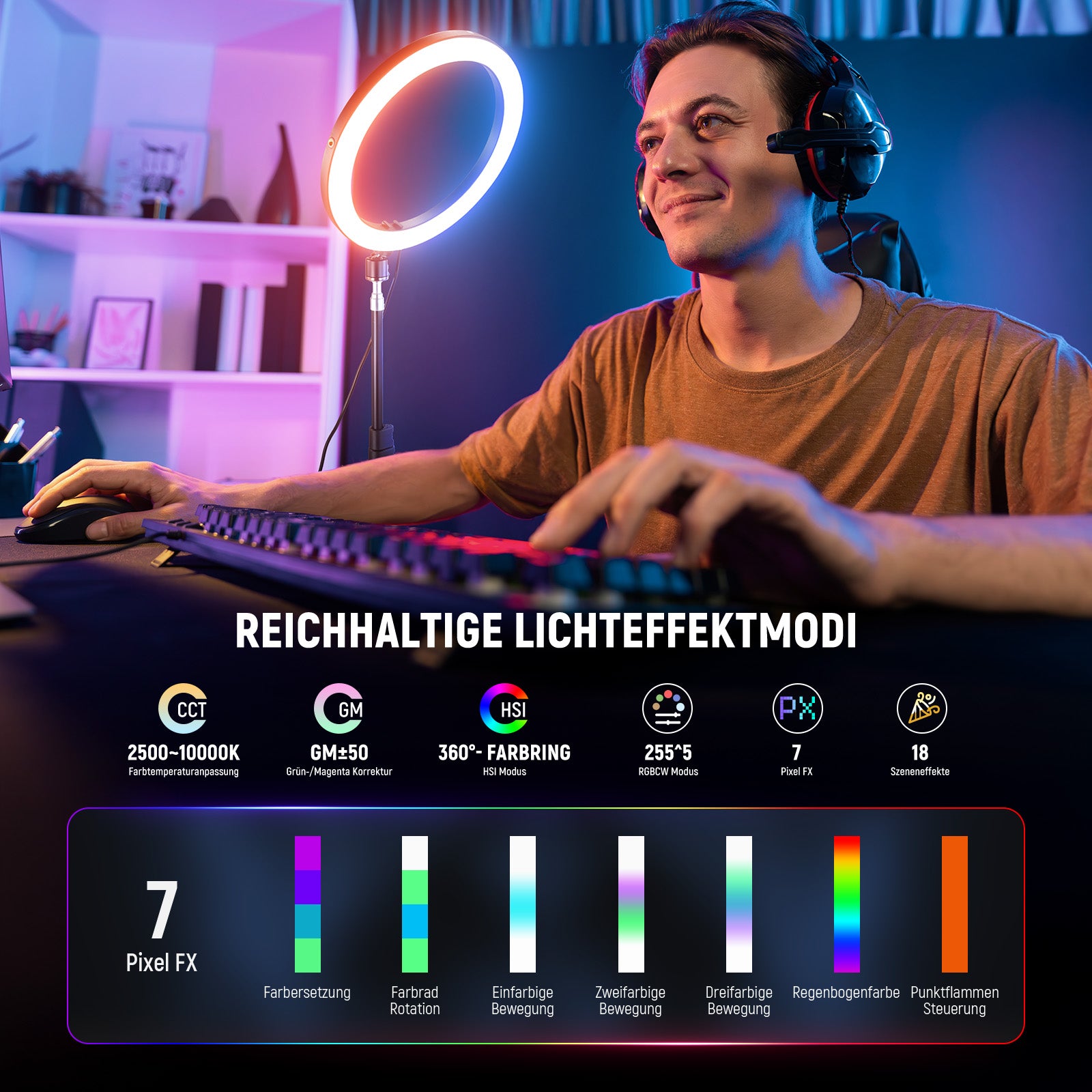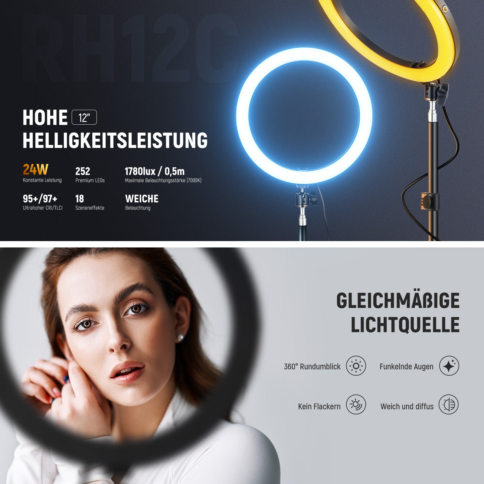 - 24W Hochleistungs RGB Ringleuchte Set- Mit 84 Warmweiß, 84 Kaltweiß und 84 RGB LEDs bietet dieses Ring Licht 360° volle RGB Farbabdeckung, 1780 Lux/0,5m (7000K) Beleuchtungsstärke, einstellbare Farbtemperatur (2500K-10000K), stufenlose Dimmung (0-100%) und CRI 95+/TLCI 97+ für helles, diffuses Licht mit exzellenter Farbtreue. Ideal als Haupt oder Aufhelllicht für Make up Artist:innen, Lash Techniker:innen, Tattoo Studios, Podcasts, Live Streaming, Zoom, Studiofotoshootings, YouTube/TikTok uvm.