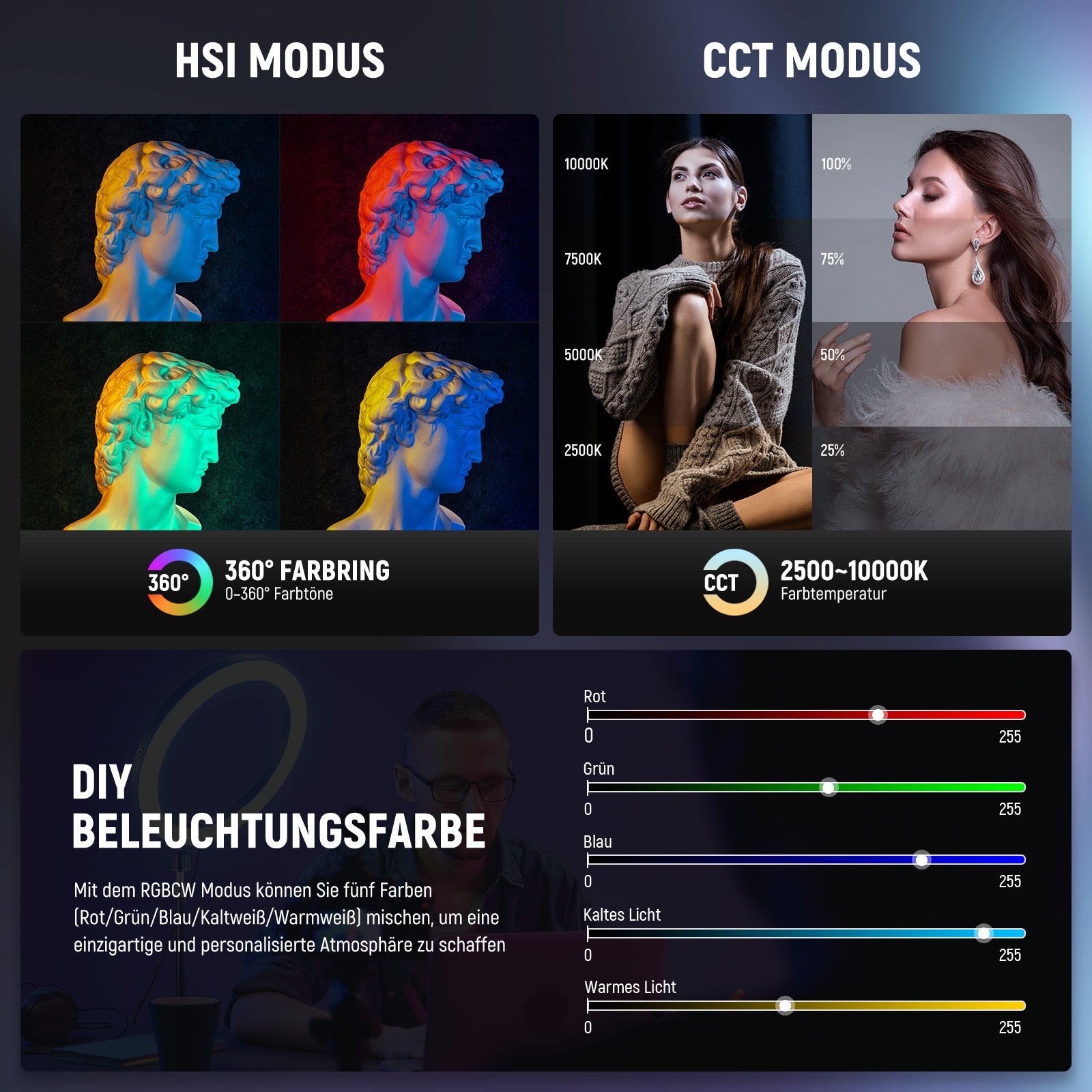 - Lichtmodi: RGBCW, HSI, CCT, FX