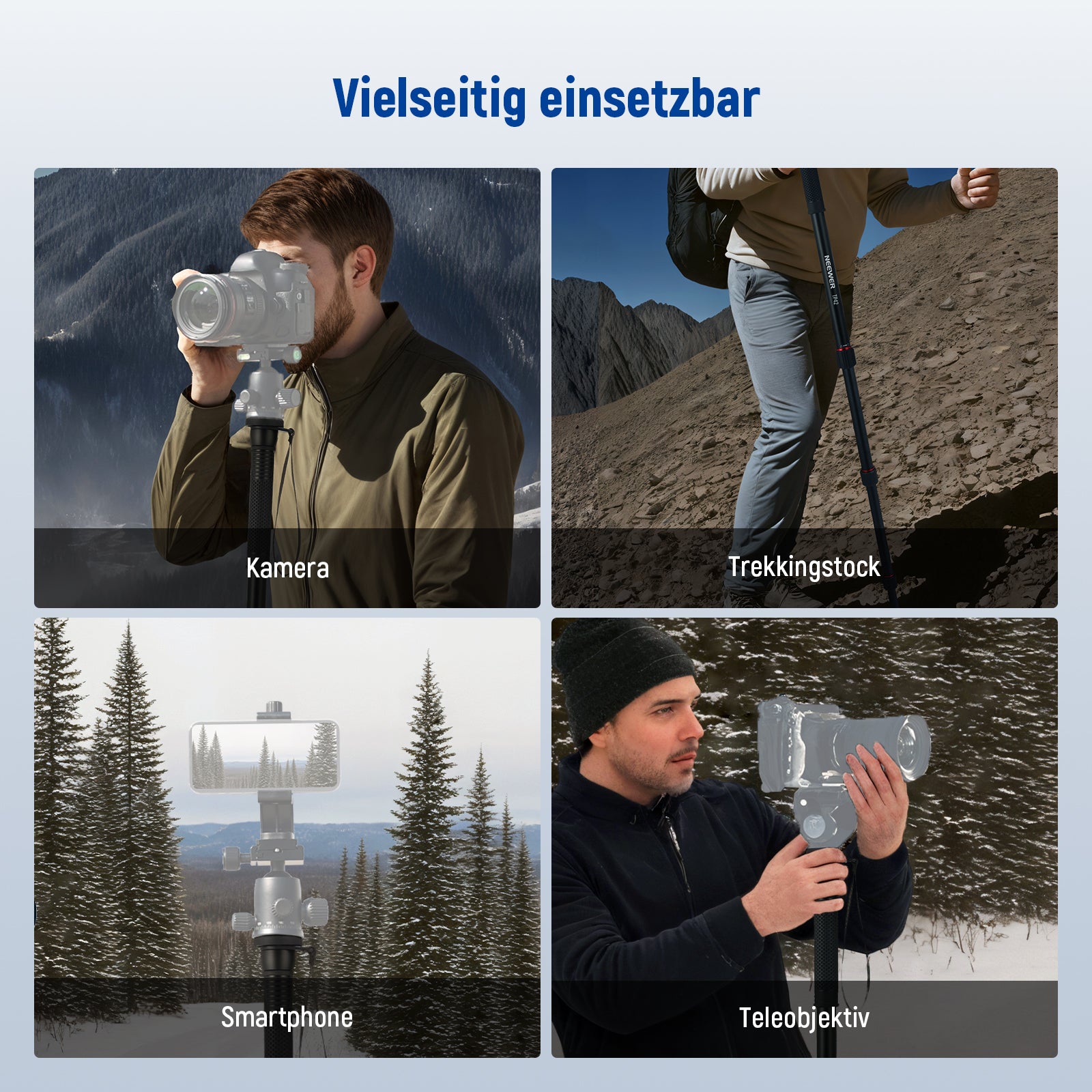 - 4 Sektionen höhenverstellbar- Verlängern Sie den Kamera Mono Pod von 22,6"/57,5cm auf 66,5"/169cm und verriegeln Sie es mit einer einfachen Drehung. Egal, ob es sich um eine Aufnahme aus einem niedrigen Winkel oder um ein weitwinkliges Panorama handelt, Sie haben die Flexibilität, die gewünschte Aufnahme zu erzielen