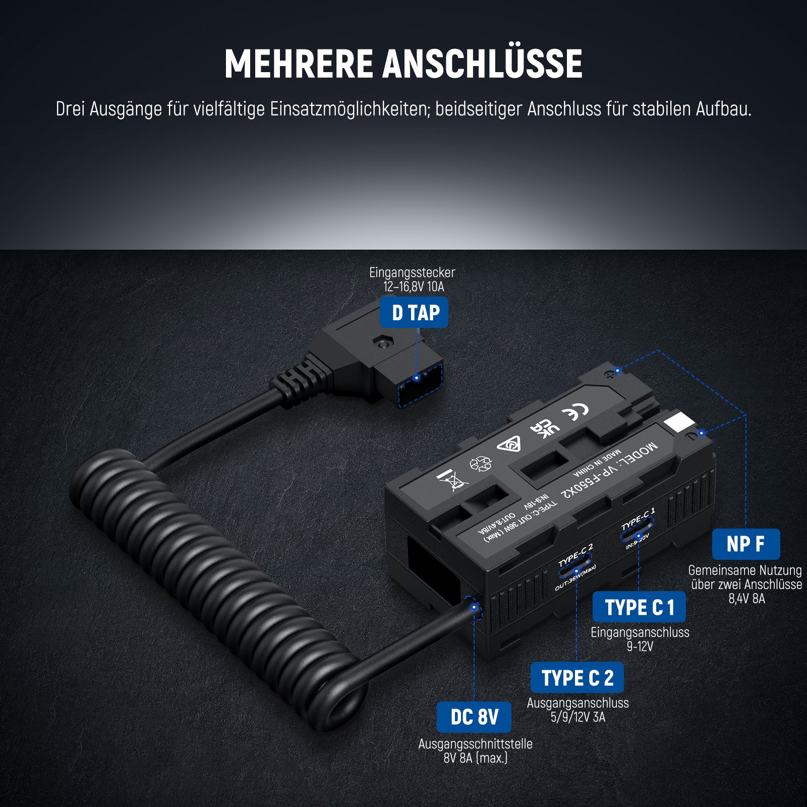 - Mehrere Stromversorgungsoptionen- Durch den Anschluss über D TAP Adapter (12-16,8V, 10A) oder Eingang vom Typ C (9-12V) können sowohl NP-F Ausgang (beide Anschlüsse teilen 8,4V, 8A) als auch USB C Ausgang (unterstützt 5V 3A/9V 3A/12V 3A PD Schnellladung) aktiviert werden, kompatibel mit Sony NP-F970 NP-F750 NP-F550 und deren Ersatzakkus. Der Typ C Eingang unterstützt V Mount Akkus und Akkupacks. Hinweis: Kameras können nicht direkt mit Strom versorgt werden, da die Spannung nicht dekodiert ist