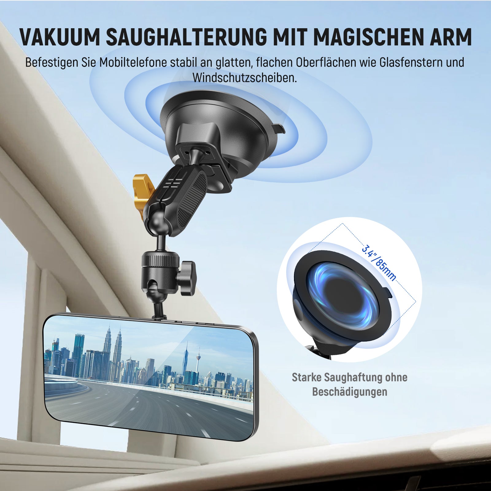 - Mächtiger Saugnapf mit Magic Arm- Der 3,35"/85mm Luftpumpen Saugnapf mit einem flexiblen Magic Arm hält fest an jeder glatten, flachen und nicht porösen Oberfläche wie der Windschutzscheibe, dem Fenster, dem Armaturenbrett oder den Kacheln und ermöglicht es Ihrem Smartphone, jeden gewünschten Winkel für POV Videoaufnahmen zu erreichen und in verschiedenen Szenen zu verwenden, wie z.B. beim Aufnehmen von lustigen Road Trip Aufnahmen, beim Ansehen von Netflix Filmen, als Handyhalterung für die Dusche