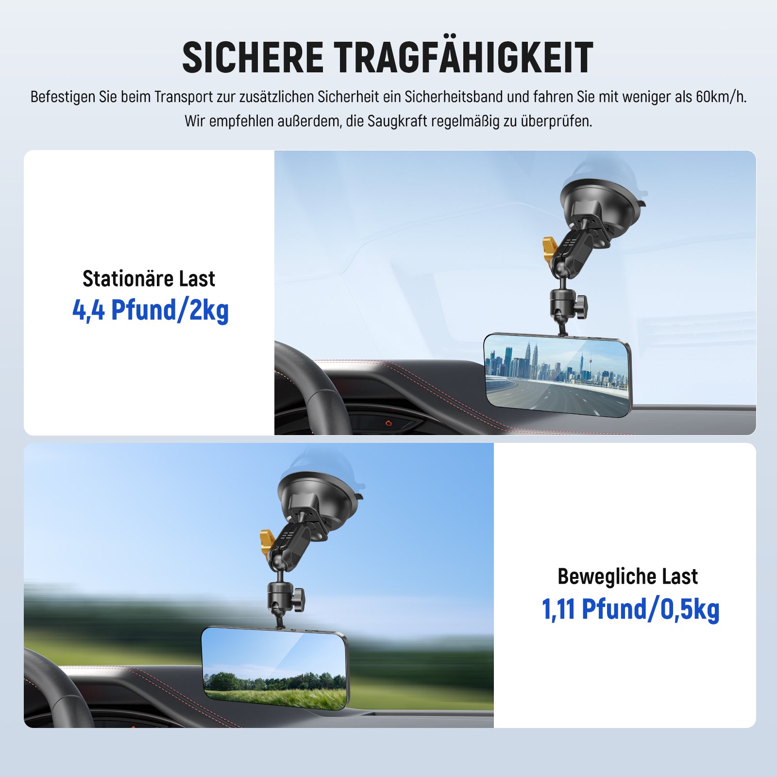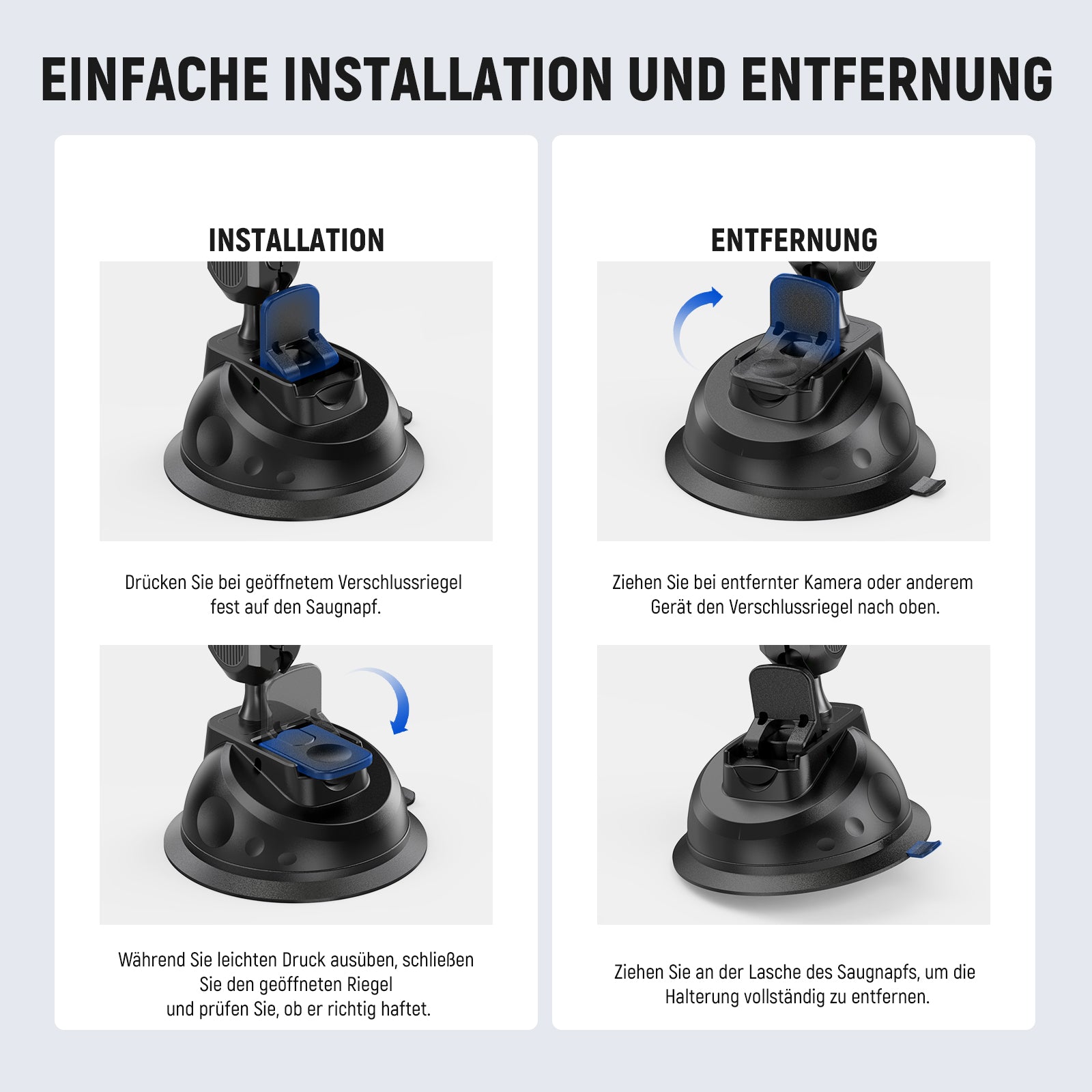 - Schnelles Verriegeln und Loslegen mit Druckschnalle- Drücken Sie einfach auf den Riegel, um die überlegene Saugkraft freizusetzen, die Ihr Telefon mühelos mit einer beweglichen Tragfähigkeit von 0,5kg und einer stationären Tragfähigkeit von 2kg stützt und so eine sichere und schnelle Einrichtung und einfache, beschädigungsfreie Entfernung gewährleistet. Hinweis: Nur für glatte, saubere Oberflächen wie Windschutzscheiben, Fenster, Armaturenbretter, Fliesen usw. Vermeiden Sie raue Oberflächen