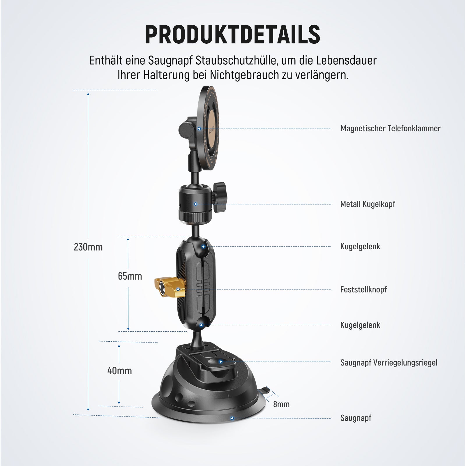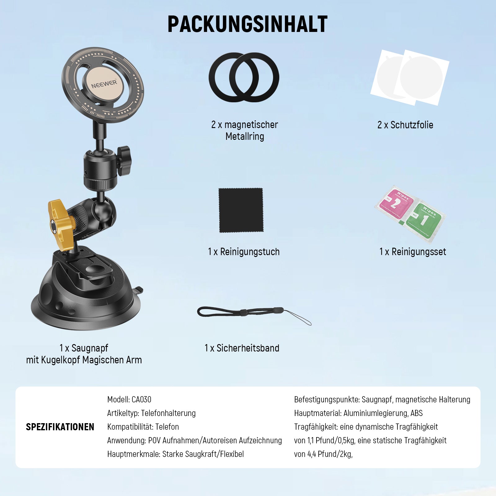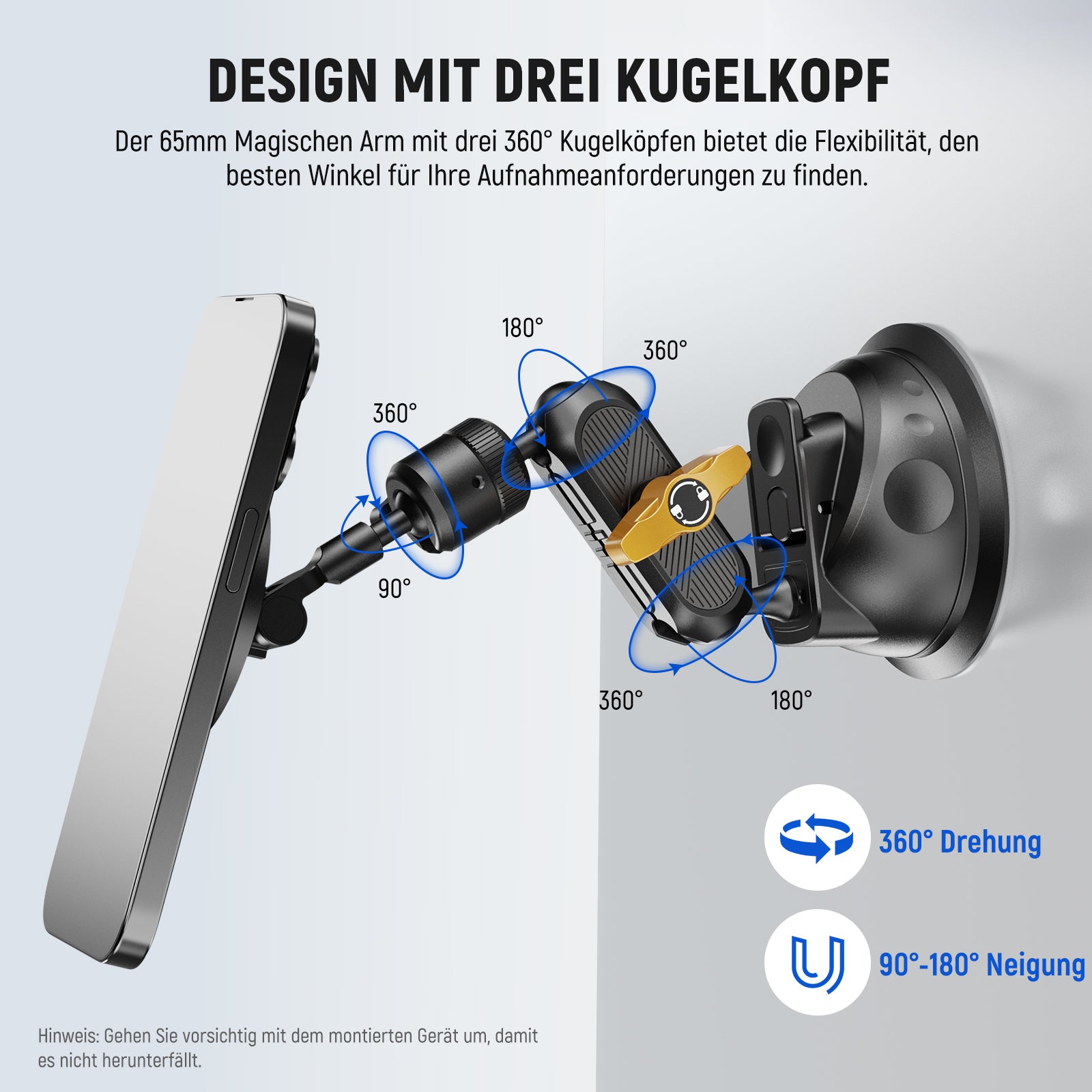 - Befestigungspunkte: Saugnapf, magnetische Telefonhalterung