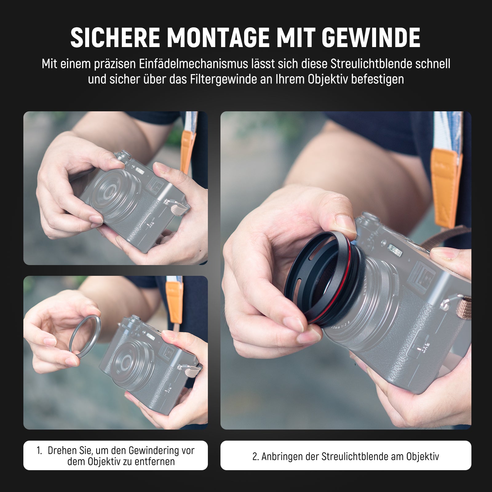 - Sichere Montage mit Gewinde- Mit einem präzisen Gewindemechanismus kann diese Gegenlichtblende über das Filtergewinde schnell und sicher an Ihrem Objektiv befestigt werden