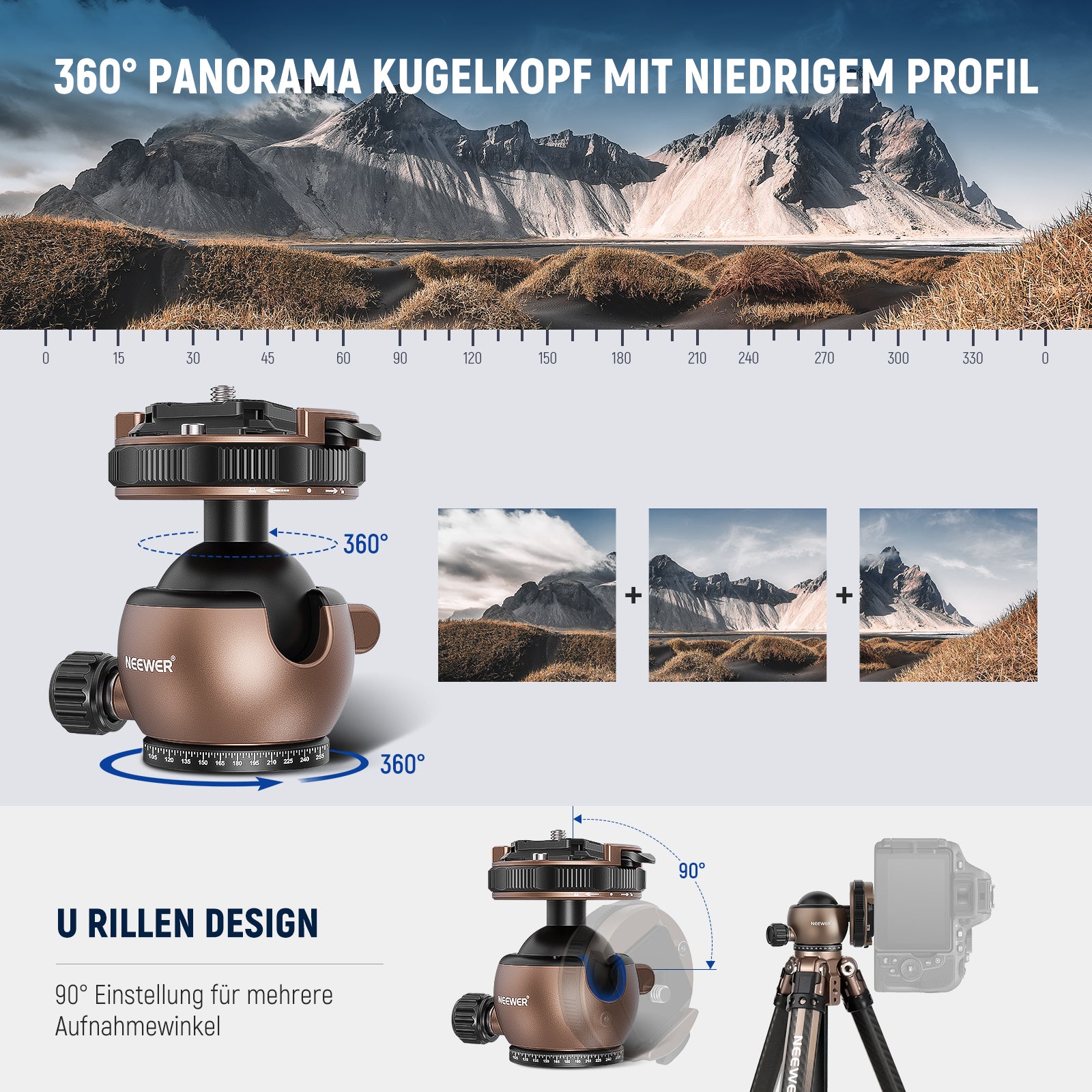- 【360° Schwenken und 90° Neigen】Der Panorama Kugelkopf mit einem einzigen U Kerben Design für 360° Drehung und 90° Vertikalaufnahmen auf flexible und dennoch stabile Weise, mit einem Klappverschluss für einen schnellen, einfachen Wechsel zwischen Hoch und Querformat. Präzise Skalenmarkierungen auf dem Kopf mit einem Feststellknopf für eine genauere und sanftere horizontale Bewegung
