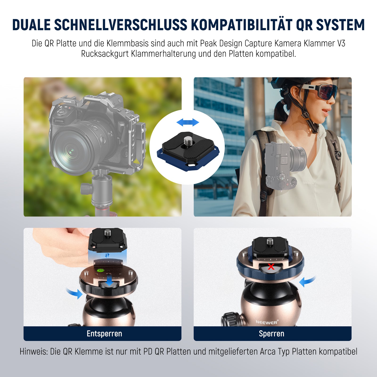 - 【Schnellverriegelung duale Kompatibilität QR System】Die Kamera Kugelhalterung verfügt über die QR Platte vom Typ Arca und die Klemmbasis, die auch kompatibel mit Peak Design Capture Kamera Klammer V3 Rucksackgurt Klammerhalterung und den Platten kompatibel sind und einen schnellen Gerätewechsel zwischen Stativ und Rucksackgurt mit dem seitlichen Schnellverriegelungsknopf ermöglichen. Hinweis: Die QR Klemme ist nur kompatibel mit PD QR Platten und mitgelieferten Platten