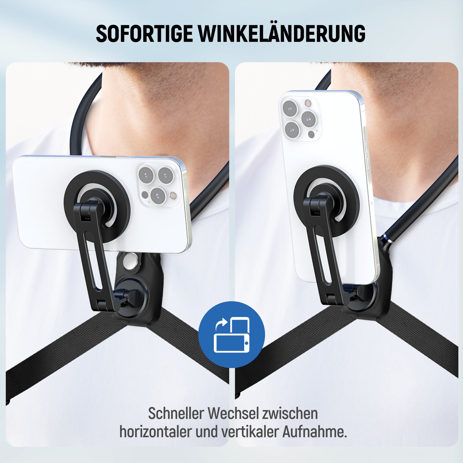 - Für POV-Videografie - Entwickelt für Smartphones und Action-Kameras ermöglichen der magnetische Schnellverschluss-Halsmontage und der Brustgurt freihändige, immersive Aufnahmen. Der verstellbare Brustgurt und das robuste, komplett aus Metall gefertigte Scharnier gewährleisten einen sicheren Halt, während die weiche Silikonhülle für Komfort am Hals oder auf der Schulter sorgt. Ausgestattet mit einem Brustgurt sorgt er für ein stabiles Filmen während des Laufens. Hinweis: Verwenden Sie den magnetischen Telefonhalter nicht in Hochgeschwindigkeits-Aktionsszenarien