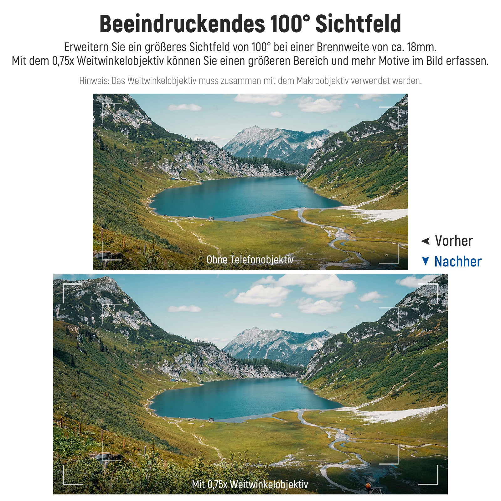 - Beeindruckendes 100° Sichtfeld- Erweitern Sie ein größeres Sichtfeld von 100° bei einer Brennweite von ca. 18mm. Mit dem 0,75-fachen Weitwinkelobjektiv können Sie einen größeren Bereich und mehr Motive im Bild erfassen, ideal für die Fotografie von Straßen, Landschaften und Architektur sowie Gruppenfotos. Hinweis: Verwenden Sie das Weitwinkelobjektiv in Verbindung mit einem Makroobjektiv, um optimale Ergebnisse zu erzielen
