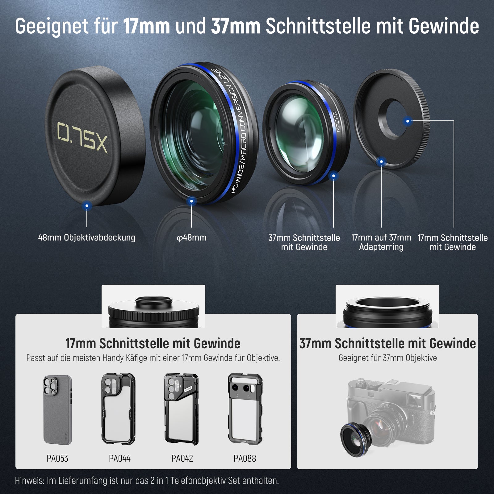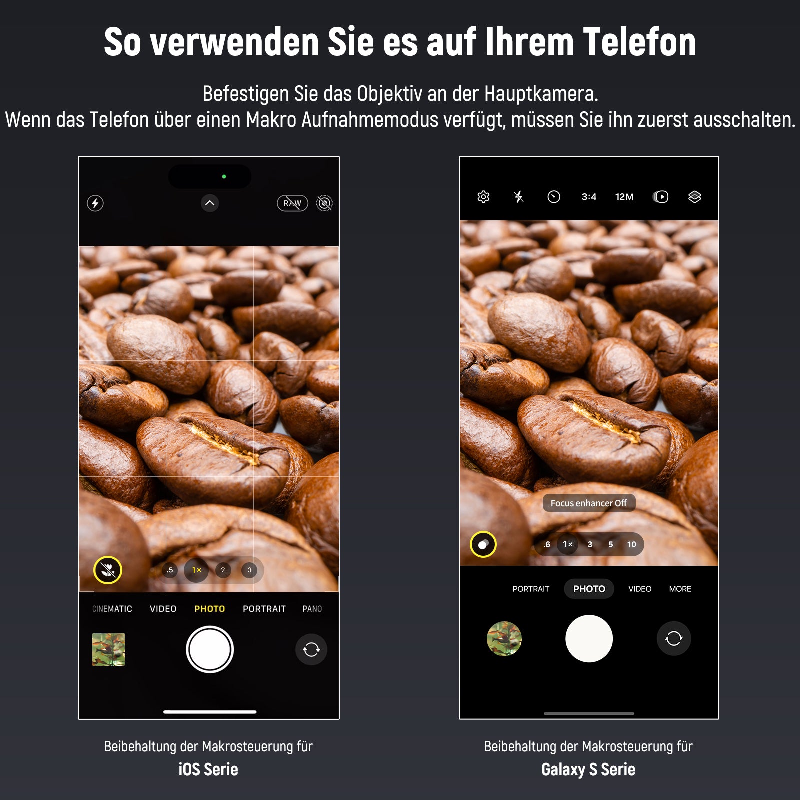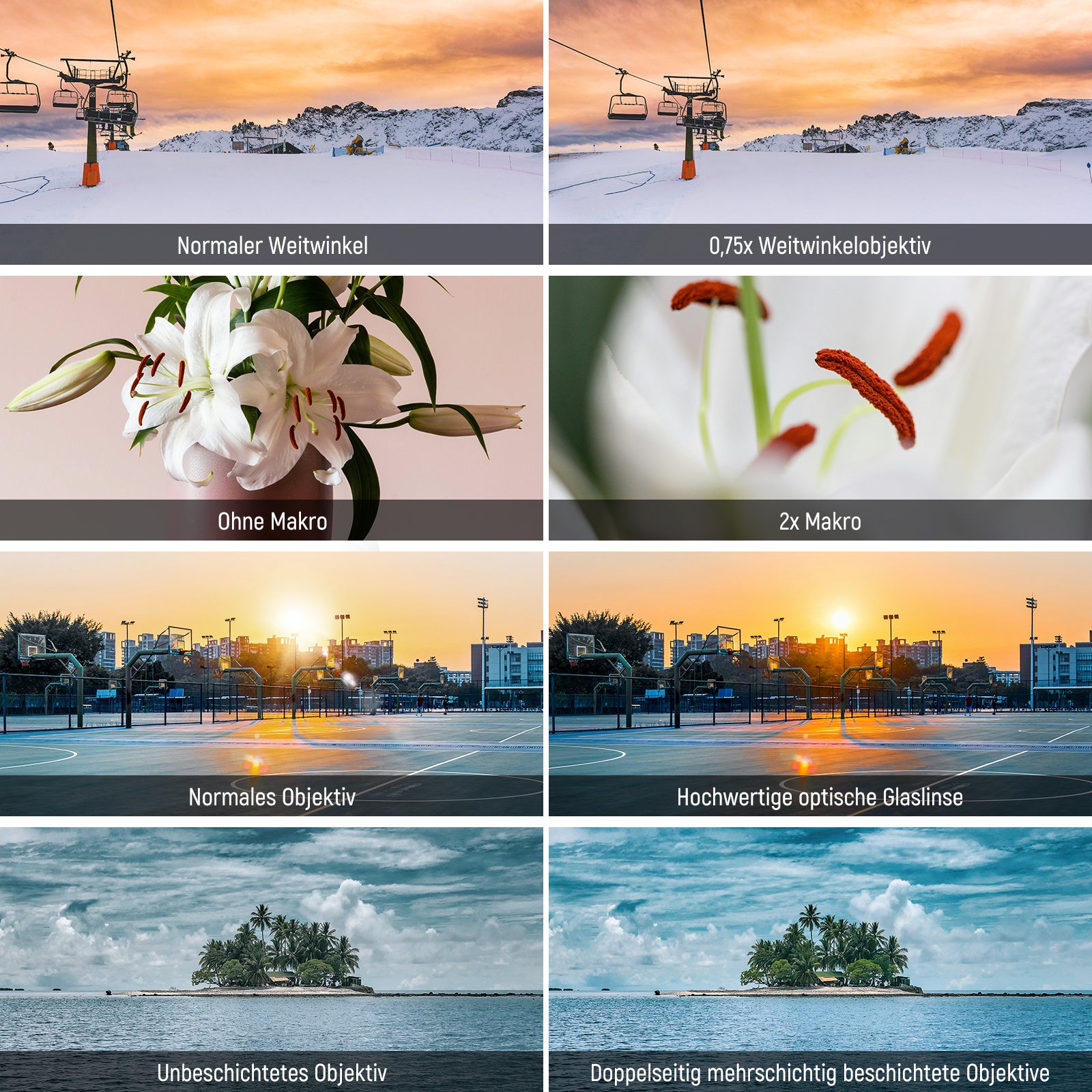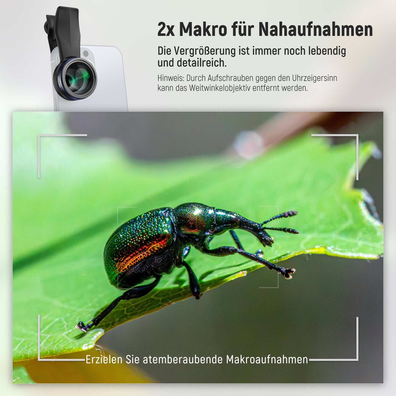 - Hauptmerkmale: 0,75x Weitwinkel & 2x Makro