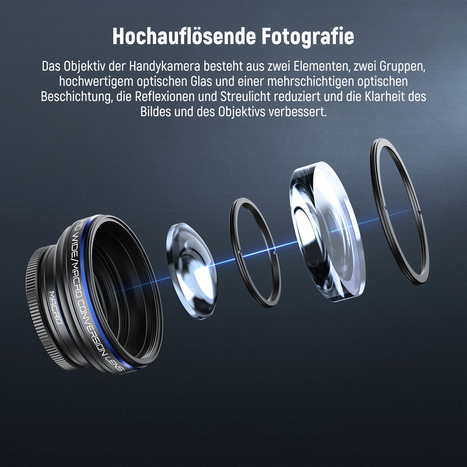 - Hochauflösende Fotografie- Der Objektivclip des Mobiltelefons besteht aus einem einzigen Objektiv mit 2 Gruppen 2 Elemente Struktur Design, hochwertigem optischem Glas und mehrschichtigen optischen Beschichtungen, die Reflexionen und Blendung reduzieren und die Schärfe der Bilder und Aufnahmen verbessern können