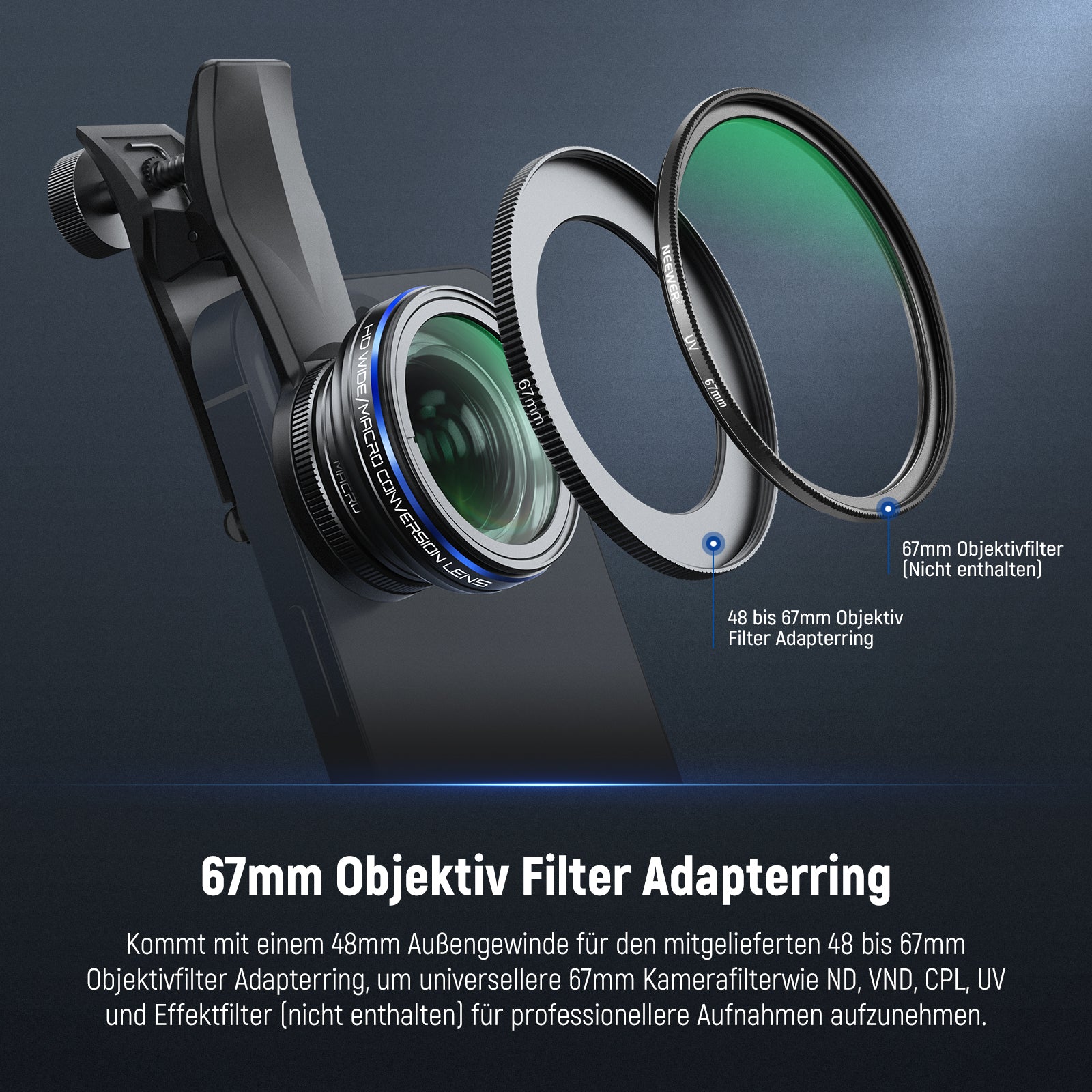 - 1 x Adapterring für vorderen Filter (passend für 67mm Filter)